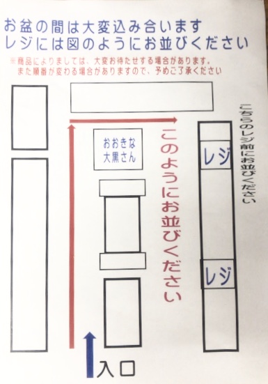 お盆の間は大変混雑いたしますので、 誠に恐れ入りますが、レジには 図のようにお並びください。 ※商品によりましては大変お待たせする場合があります。また、順番が前後する場合もありますので、予めご了承ください。