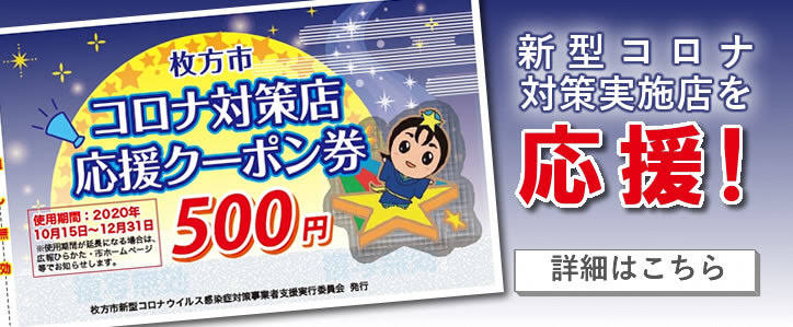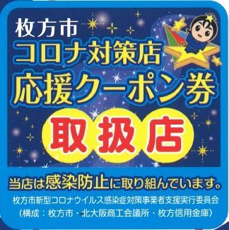 枚方市コロナ対策店応援クーポン券、 当店でご利用できます❗️ 開始早々沢山のお客様が利用されてます。 ※枚方市コロナ対策実施店応援事業とは、 市内事業者における感染症対策の促進をはかるために、枚方市新型コロナウイルス感染症対策事業者支援実行委員会において、令和2年10月15日より 枚方市コロナ対策実施店舗応援事業を開始しました。