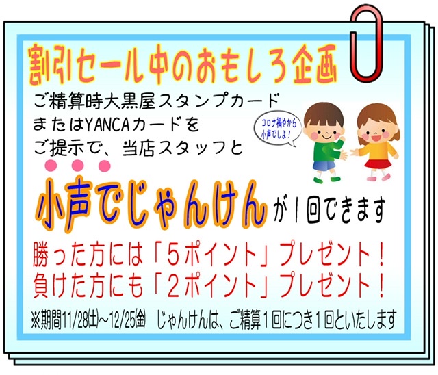 先月末からの割引セールのおもしろ企画 「小声でジャンケン」! とても楽しんでいただいてます(o^^o) 当店のスタンプカードかYANCAカードご提示で ご精算ごとにジャンケンができます。 毎日ご来店ご精算ですと、毎日小声でジャンケンができますヨ(笑) 12/25(金)まだ開催してますので、ぜひご来店くださいね!