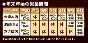 年末年始の営業時間のご案内です。 12/31は特に混み合います。 お時間に余裕を持ってご来店ください。 大峰本店 新年菓おいも巻・正月餅のご注文の方は、入口付近にお渡しコーナーを設置いたしますので、お買い物の最後にお受け取りいただくとスムーズです。
