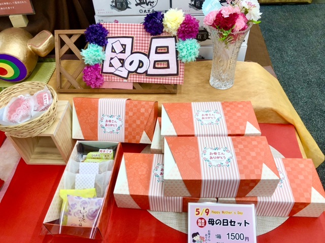 母の日のカーネーションもなか、とても良く売れてます。 今時点で残り30セット前後です。こちらは数量限定につき、もうすぐ完売すると思いますので、 ご予約はお早めに。※売り切れの節はご容赦ください。 またお菓子の詰め合わせもよく出ております。 かわいい箱の中に「みかさの母の日バージョン」2個・「ひらかたリーフパイ」2枚・焼き芋最中1個・パフケーキ「山田池の月」「淀川の四季」が各1個がアソートに。1箱 1,500円税込です。