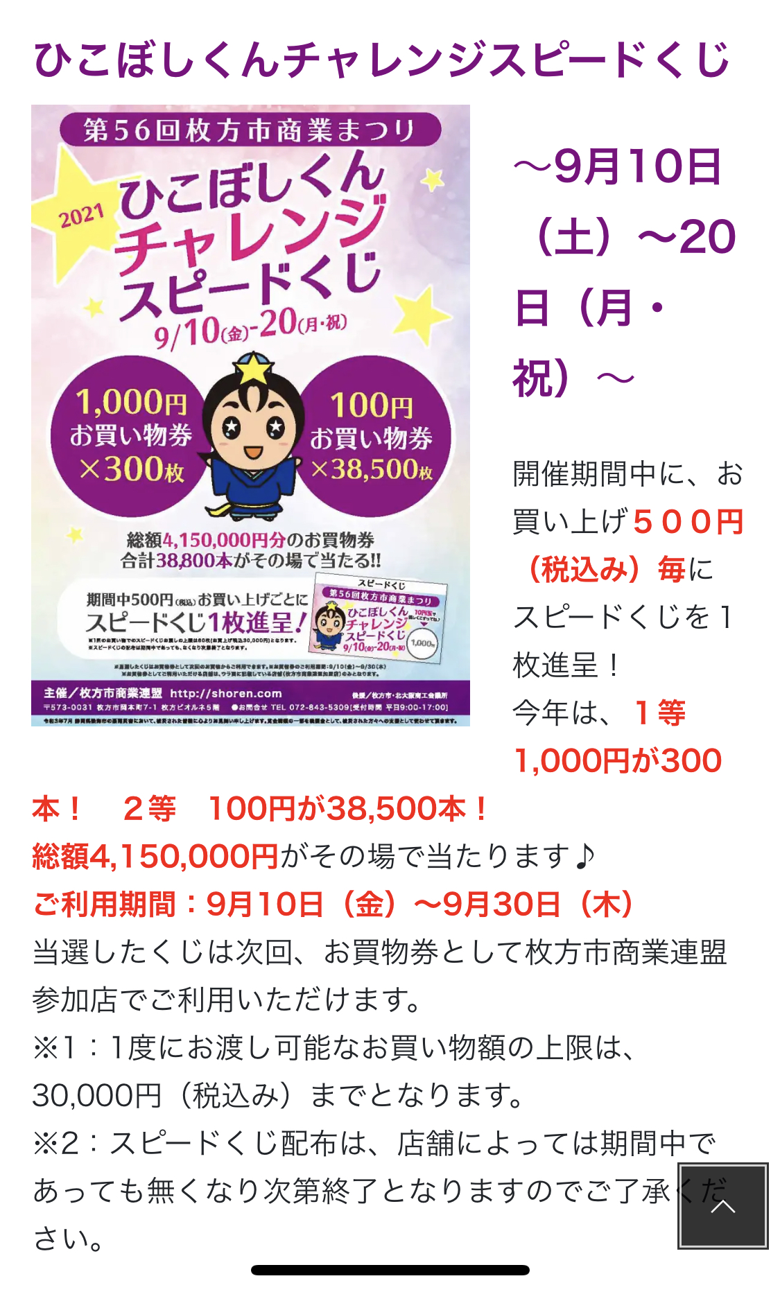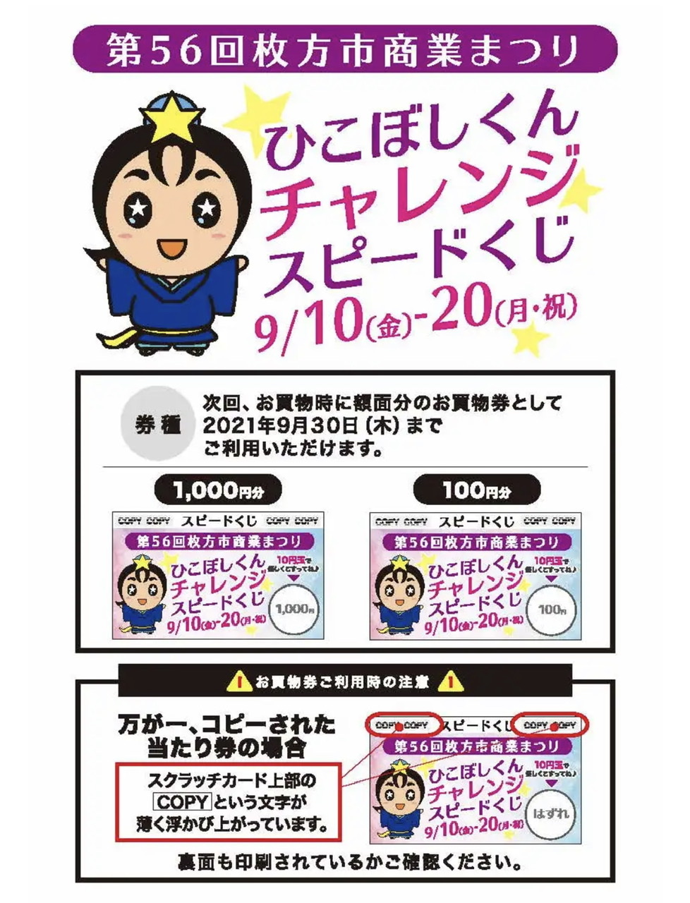 本日より、第56回枚方市商業まつり「ひこぼしくんチャレンジスピードくじ」がスタートします。 税込500円お買い上げごとにくじを1枚お渡しします。 毎年より高確率で1,000円・100円のお買い物券が当たらそうですよ❗️ なお、当たったお買い物券は「当店」をはじめ お近くの参加店でご利用いただけます。 9/20までの催しで、くじがなくなり次第終了とさせていただきます。 お早めにゲットしてくださいね😊