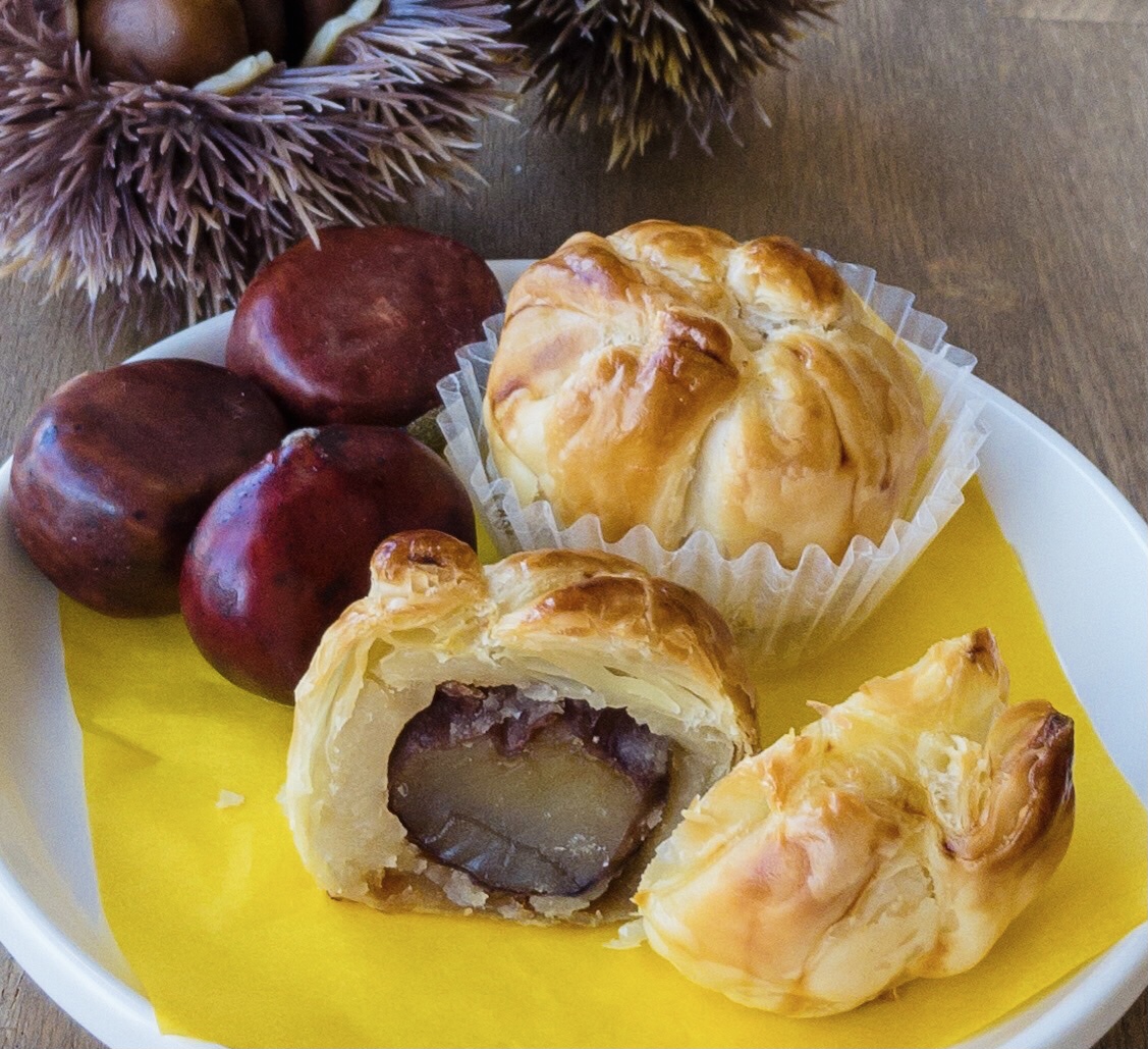この秋の新商品のご案内です。 贅沢な一粒渋皮栗の甘露煮を白餡でくるみ、 フレッシュバターを何層にも織込んだパイ生地で 包み、じっくりと焼き上げました。 バターと渋皮栗のマリアージュを是非ご賞味ください! おひとつ240円(税込259円)