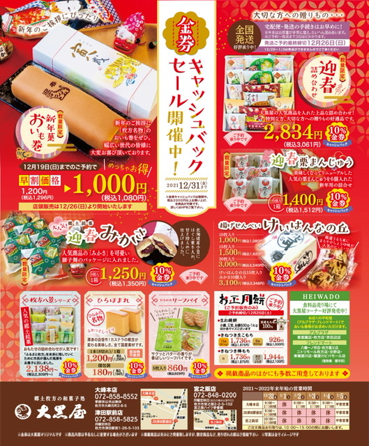 ※1 但し、早割価格の「新年菓おいも巻」のみ対象外となります。(12/20以降定価販売の「新年菓おいも巻」は、対象となります)また、ネットショップ・配達サービスは金券キャッシュバックの対象外となりますので、予めご了承ください。
