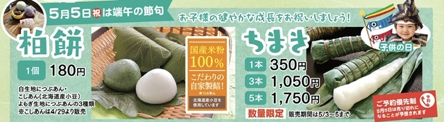 ちまきは、毎年5/5には売り切れてしまいますので、 出来るだけご予約をおススメいたします! お電話でのご予約を承っておりますので、 よろしくお願いいたします。※(お電話でのご予約は、10:00〜16:00の間くらいにお願いします)