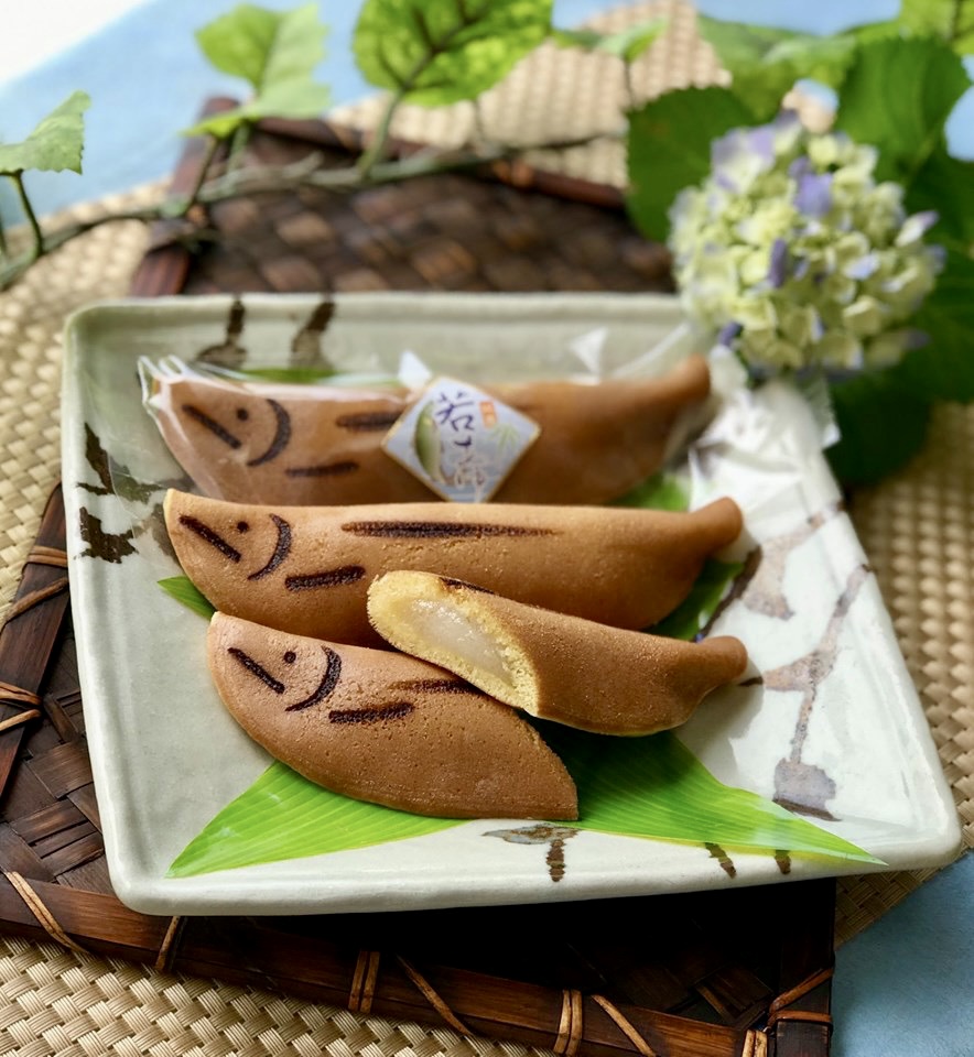 初夏に人気の和生菓子「若鮎」の 販売を始めました! 小判形に薄く伸ばしたどら焼きの生地に、 甘さ控えめモチモチの求肥を乗せて、 長年の技術で、手際よく鮎の姿に整えます。 これからの季節、冷たいお茶によく合いますよ! 手みやげにも喜ばれることうけあいです(^^) 税込216円