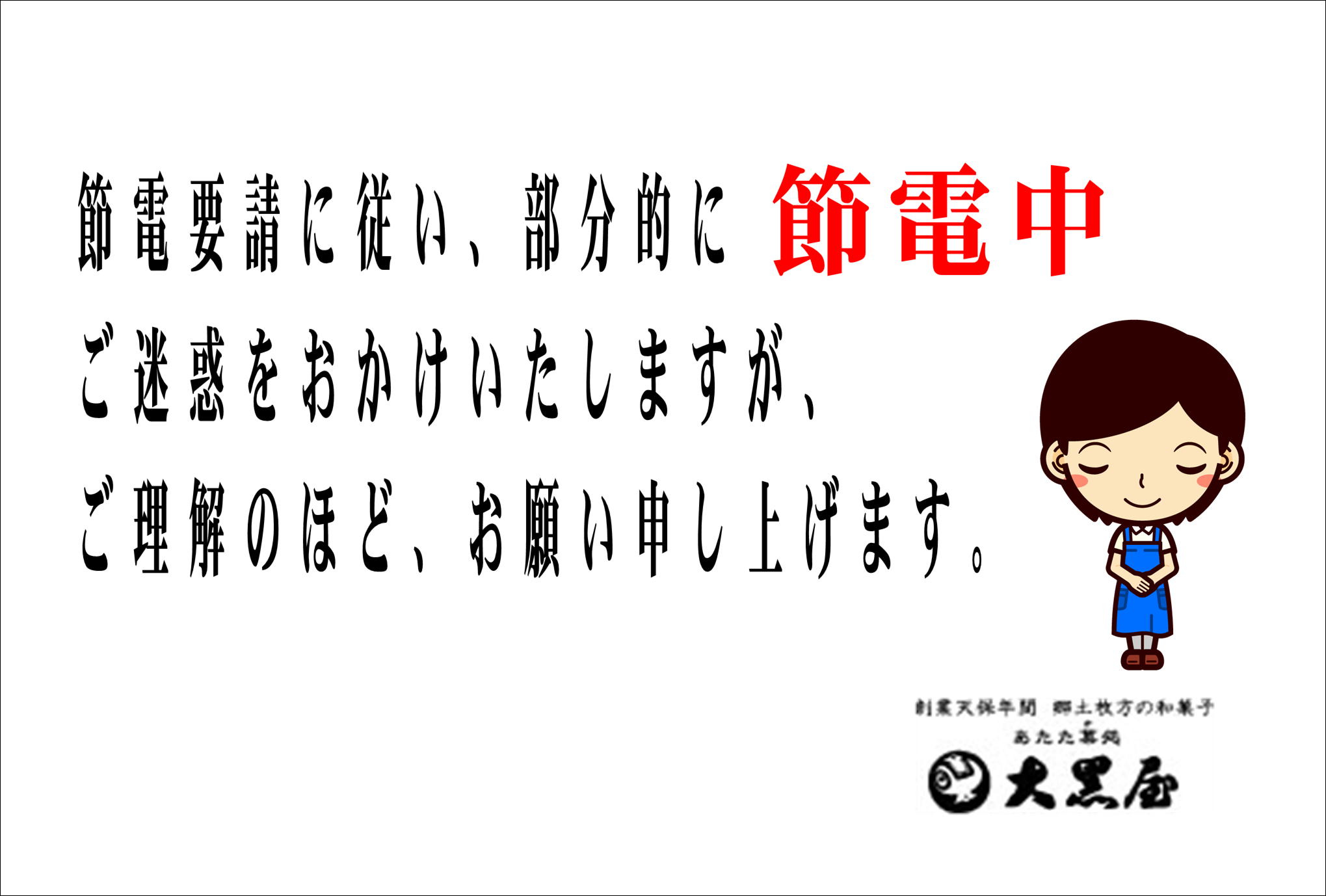 政府の要請に従い、各店部分的に節電を行っております。 ご迷惑をおかけいたしますが、ご理解のほど よろしくお願い申し上げます。