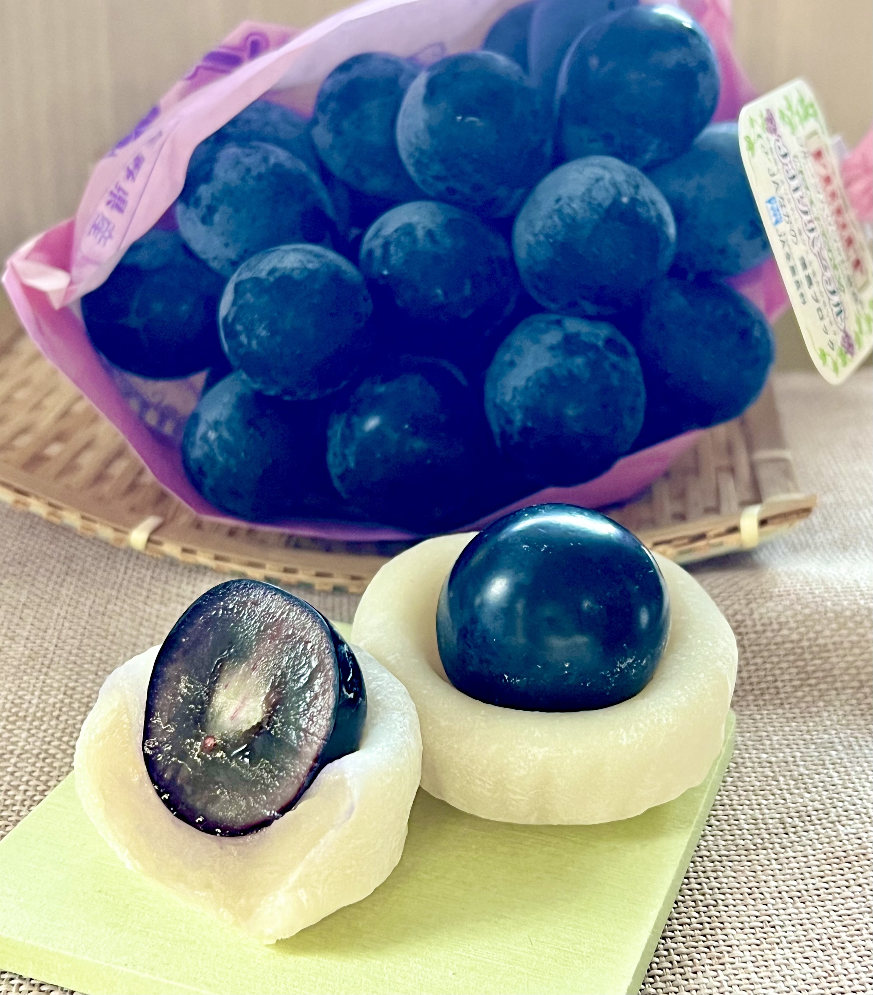朝晩すこーしだけ暑さがマシになりましたね。 昨日とてもフレッシュな「ナガノパープル」が入荷しました! ナガノパープルは名前の通り、長野県でしか作ってないプレミアム葡萄です! 皮が柔らかく種なしで、濃厚な味が特徴です。 甘さ控えめの白あんを包んだ柔らかいお餅の上に、 大きめでジューシーな葡萄を乗せました! 葡萄の甘味と軽やかな酸味とお餅の絶妙な 美味しさが堪りません(≧∇≦) 期間限定商品です。ぜひご賞味くださいね。 おひとつ 税込378円