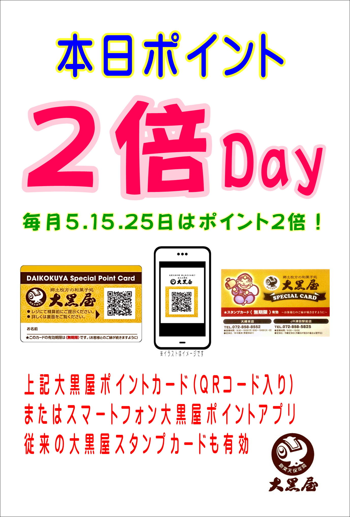 本日はポイント2倍デーです! 毎月5.15.25日はポイント2倍デーです。 100円お買い上げにつき1Pが2Pに! 手みやげ・ご進物などを購入すれば、 めっちゃポイントが貯まりますよ☺️ ※YANCAカードは対象外となっております。