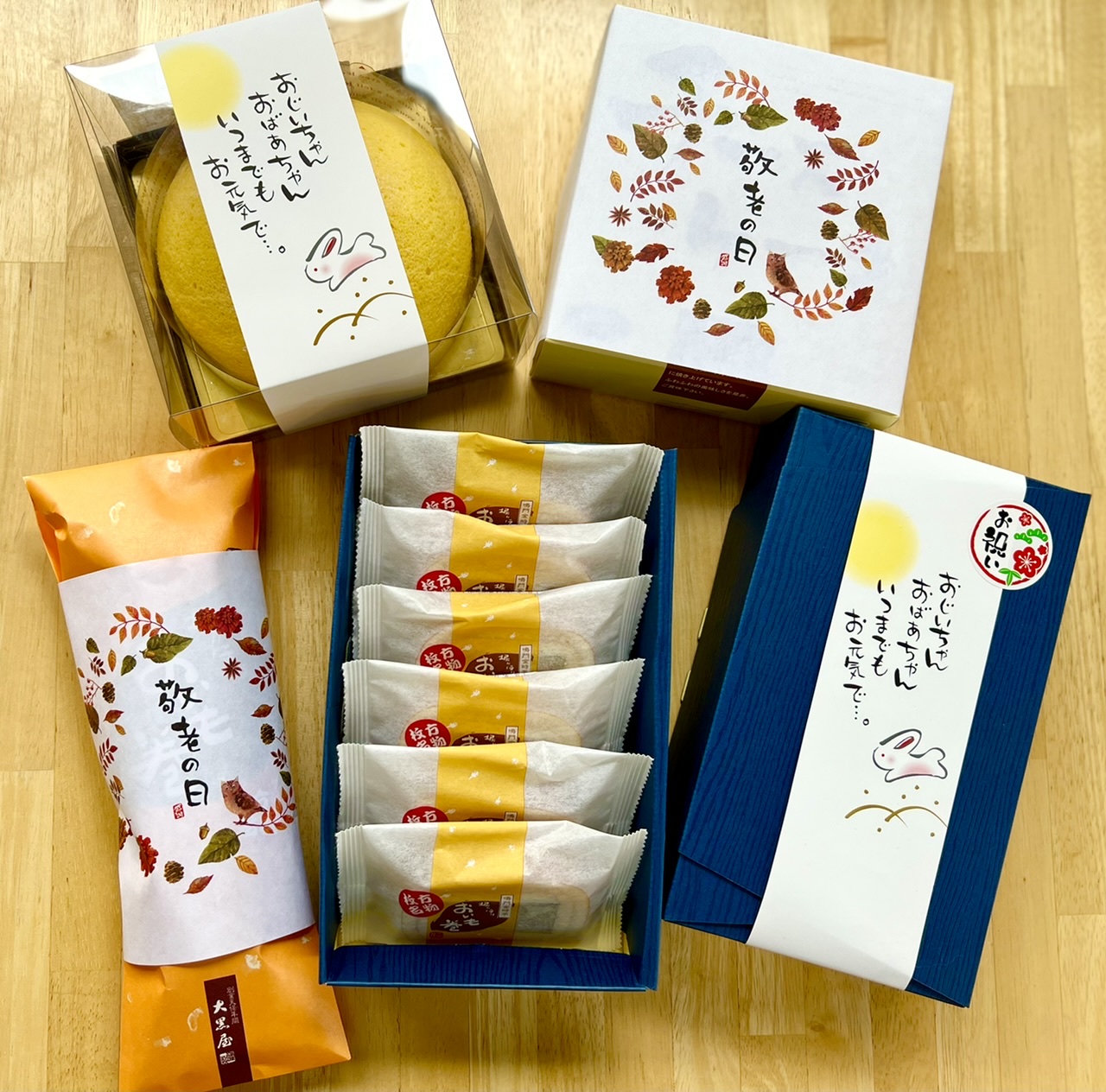 敬老の日のお祝いに、当店人気商品に掛け紙おつけできます!「おいも巻Sサイズ」や、最近よく売れてる「おいも巻6個入」、「まぁるいチーズケーキプレミアム」「スフレチーズケーキ」など… 詰合せ商品にも掛け紙おつけできますので、お気軽にお声掛けくださいね。