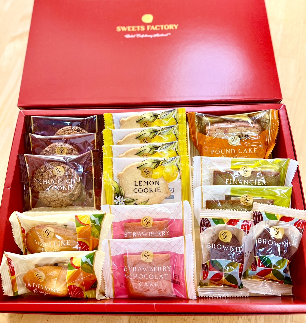新アイテム! 箱入り洋風アソートのご案内です。 「スイーツファクトリー」。クッキー・パウンドケーキ・マドレーヌ・フィナンシェなど人気の洋菓子詰合せです♪ 例えばおうちランチ会のデザートに、手みやげとして。 おまたせ・おみやげ・ご進物にも… 是非お求めくださいね! 1箱 2,100円(税込) ※当店のオリジナル商品ではありません