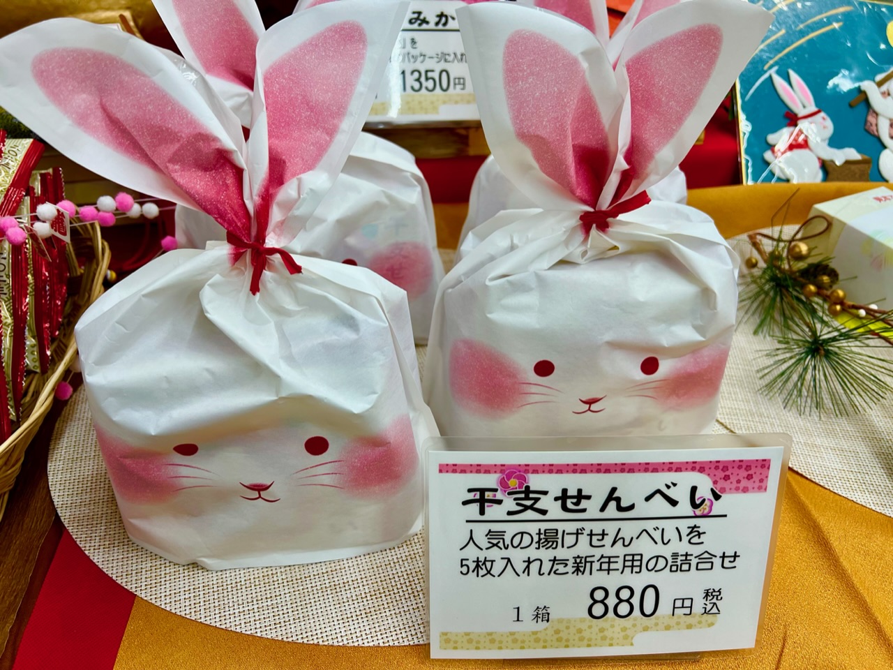 来年の干支「卯」がデザインされた、おめでたいおせんべいが5枚入ったかわいい「干支せんべい」、とてもよく売れてます。 数量限定ですので、年末ギリギリまでに売り切れるかも⁉️ お買い求めは、お早めに☺️