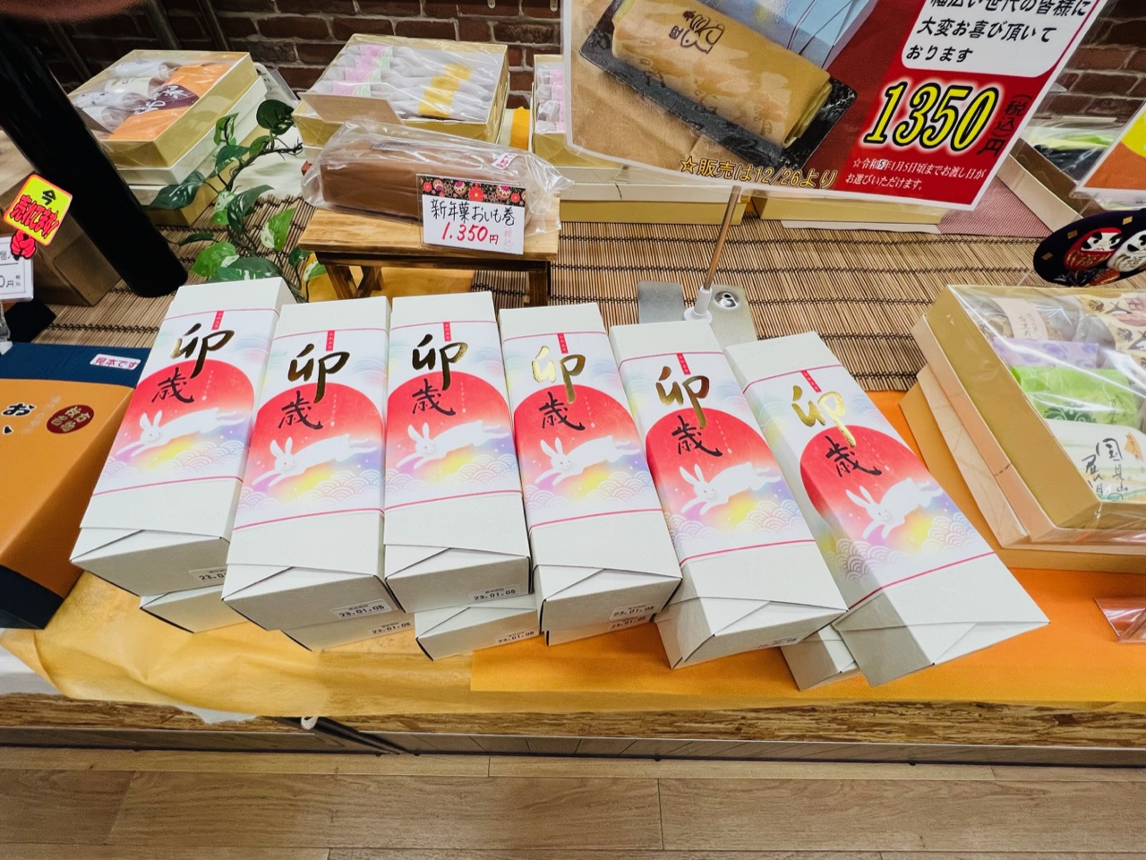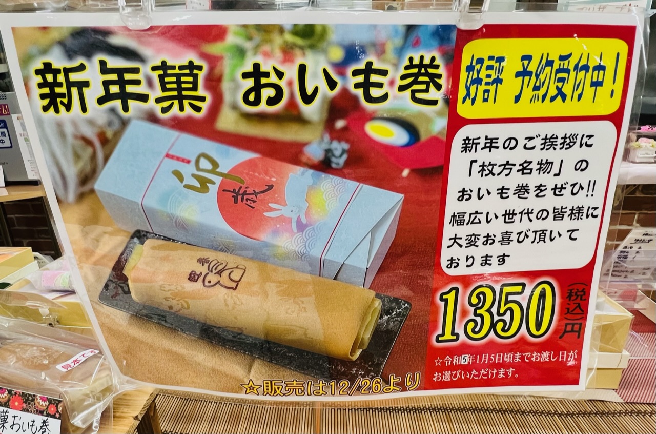 本日より「新年菓おいも巻」の店頭販売を始めました! 各店限定数での販売となります。 製造予定数も残りわずかとなってきましたが、まだご予約可能でございます。 お電話・ご来店で、お気軽にお問い合わせください。 ※尚、ご予約終了の節はご容赦ください。