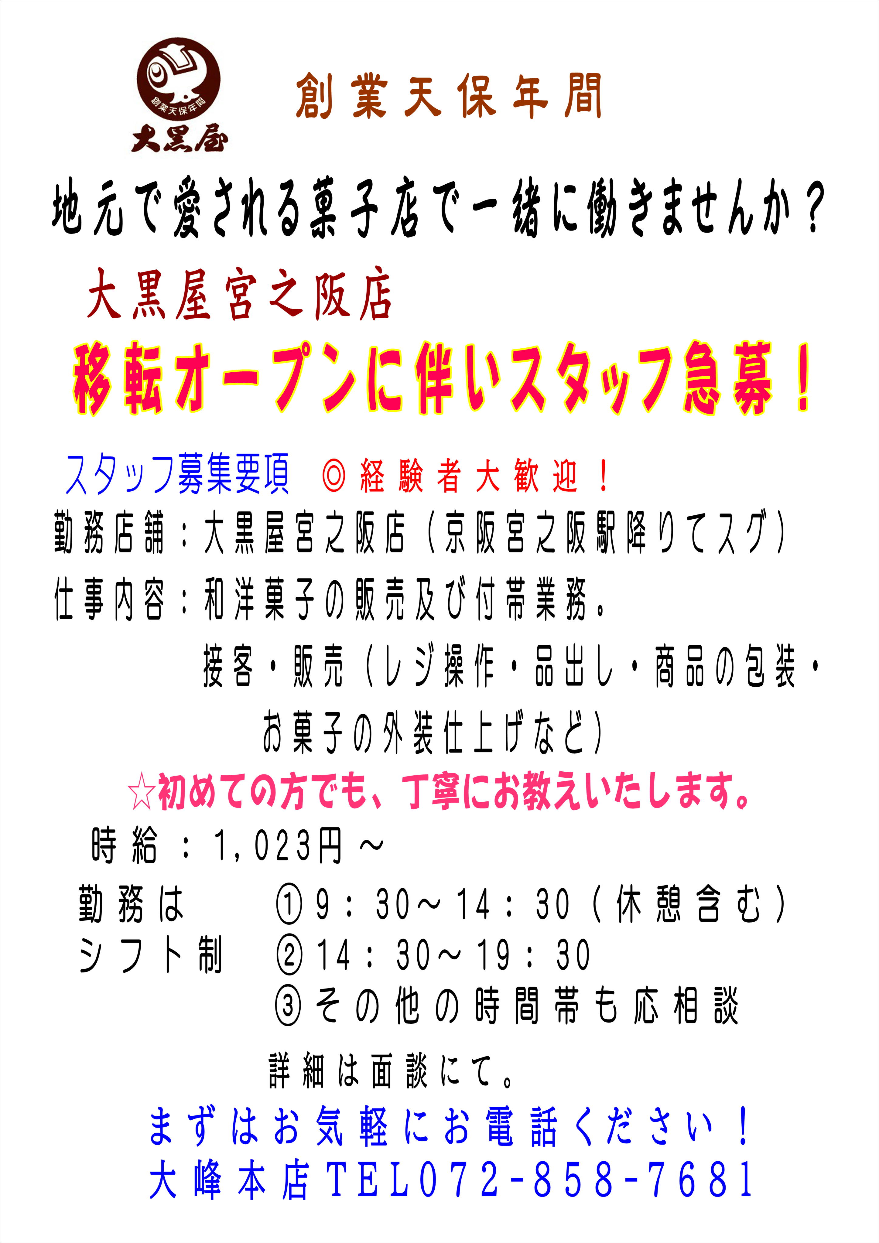 大黒屋宮之阪店 2/17㈮移転オープンにつき 販売スタッフ急募! 詳しくは画像の「求人募集要項」をご覧ください。