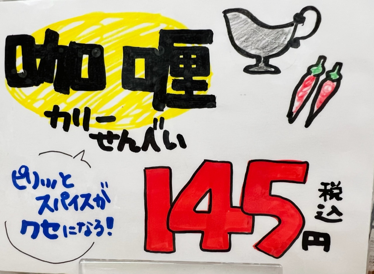 人気の揚げせんべいシリーズに新しい仲間が加わりました。「咖喱せんべい」 ピリッとスパイスがクセになる美味しさです❗️ ぜひご賞味ください! 1枚 145円(税込)