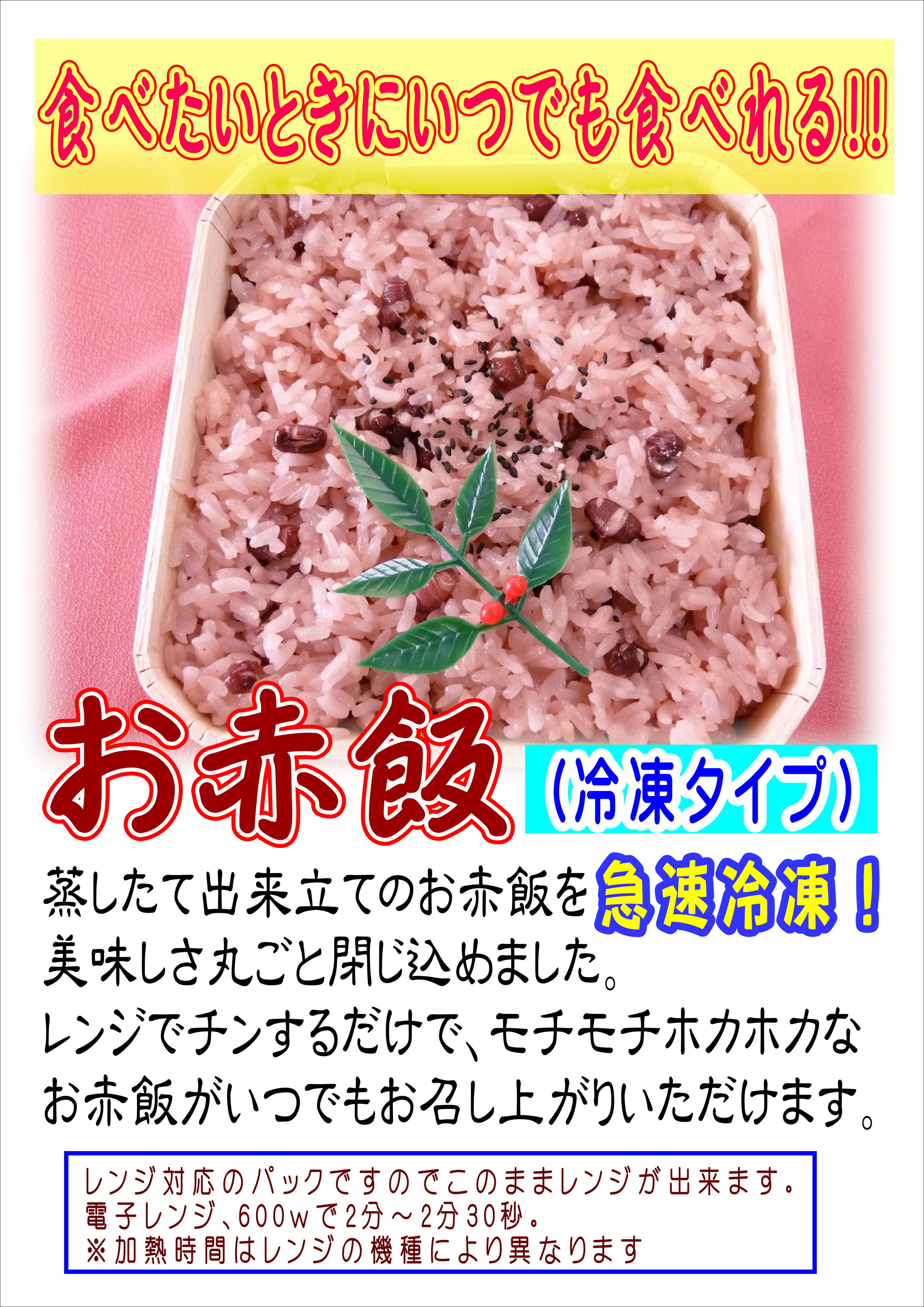 「美味しい❗️」ととても好評をいただいてます、 「お赤飯」に冷凍タイプが登場しました❗️ いつも売り切れることが多いので、こちらをストックしていただければ、食べたいときにレンジで「チン」するだけで、出来たてのお赤飯が召し上がれます。 当店工場で蒸したてを、最新のフリーザーで素早く 「急速冷凍」してますので、品質には自信があります! 是非お買い求めくださいね♪ 1パック 500円 (小パックのみ) ※当店ポイント会員さまの場合、2パックまで375円でお求めいただけます❗️