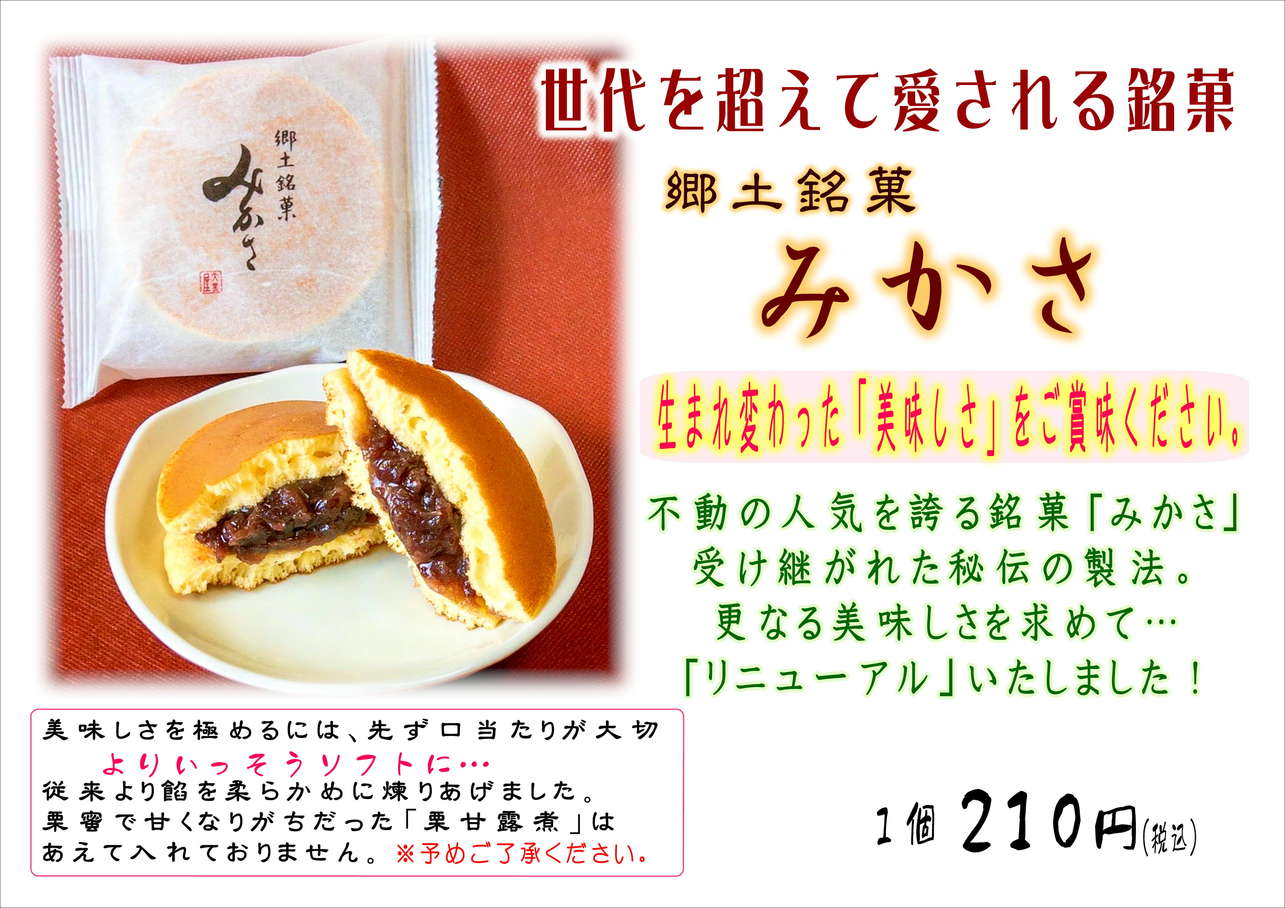 明日9/29(金) 「郷土銘菓みかさ」が、リニューアル新発売いたします。 世代を超えて愛される銘菓が、 よりソフトな生地に、より甘さ控えめの餡が絶妙な美味しさを奏でます♪ 是非ご賞味くださいね❗️