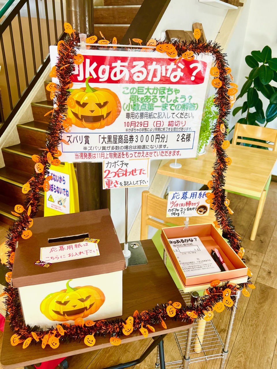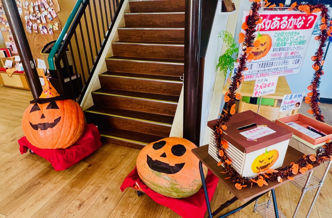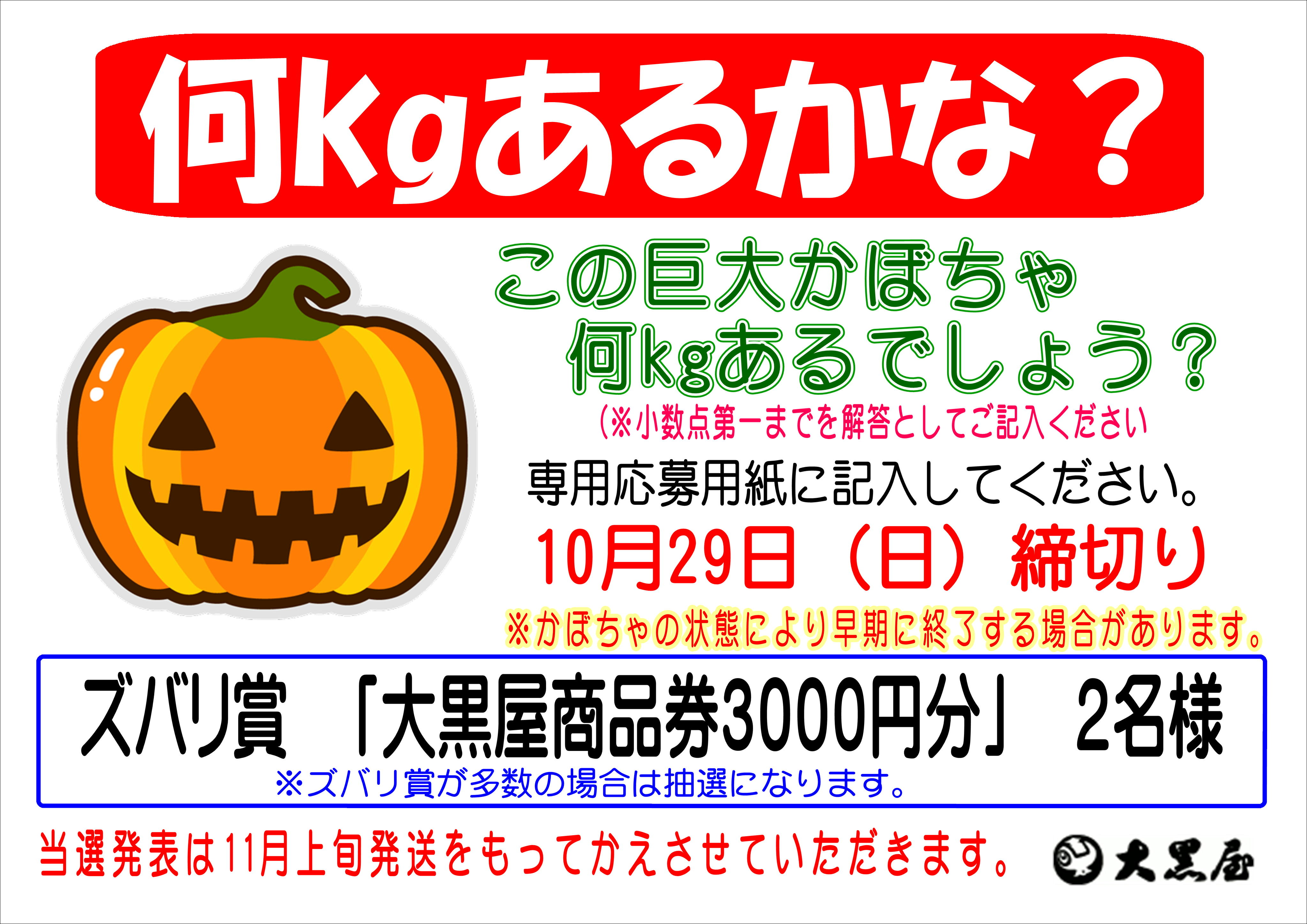 全店で開催! ズバリ賞🏆は大黒屋商品券❗️ 「🎃何キロあるかな?」クイズ☺️ ご来店の上、ぜひご参加くださいね♪ 本店は画像の🎃2個の合計の重さを🎯当ててください。 なお、あまりに大きいので、持ち上げないように願います 応募締め切りは10/29(日)です。 ※各店で🎃カボチャの大きさと賞品が異なります。 予めご了承ください。