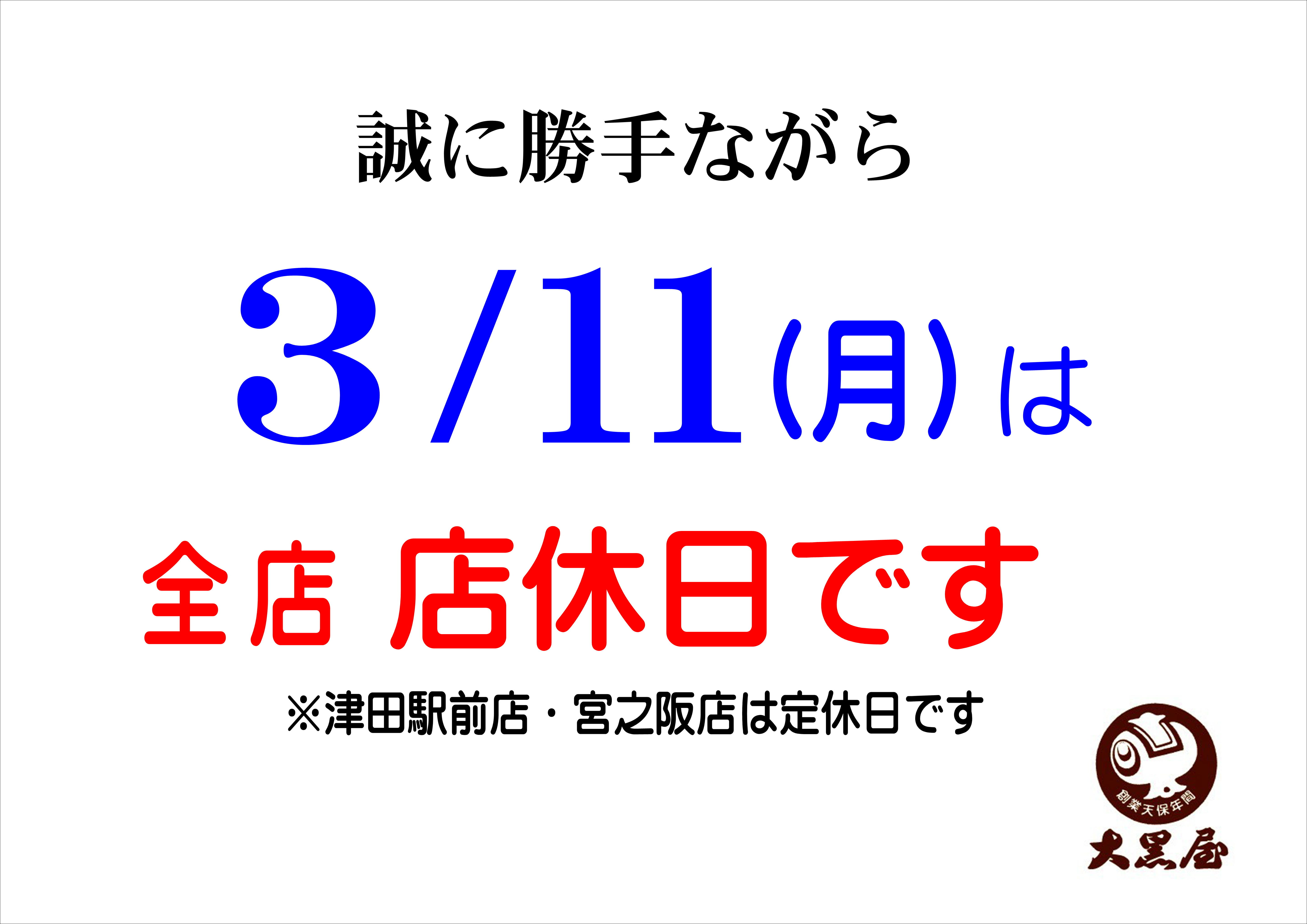 明日3/11(月)は全店休業いたします。 ご迷惑をおかけいたしますが、何卒よろしくお願い申し上げます。