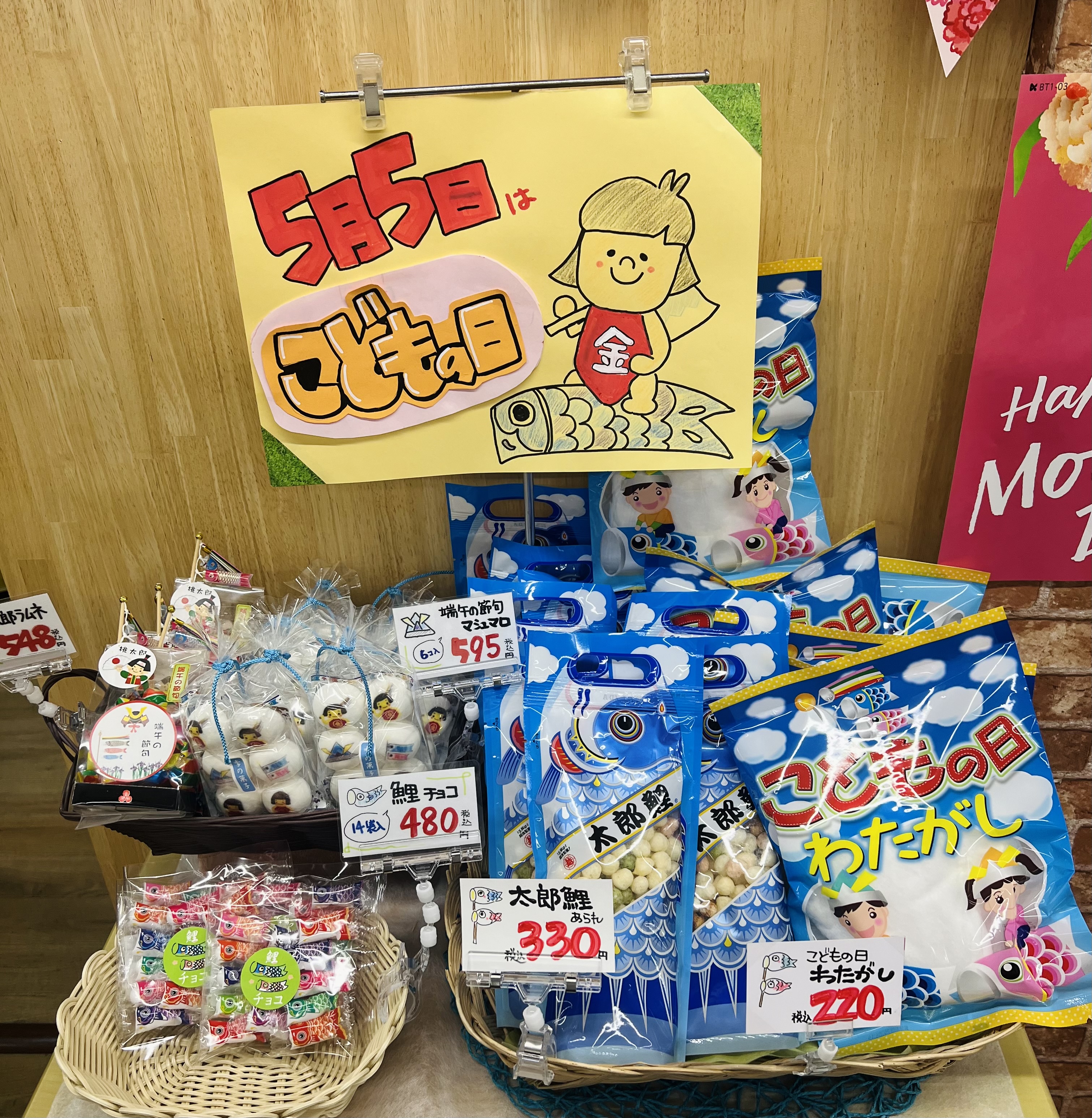 🎏子供の日の袋菓子あります! デザインが可愛い、マシュマロ・わたがし・あられ・チョコラムネなど。 数量限定のため、売切れの節はご容赦ください。 ※店舗によって取扱商品が異なります。予めご了承ください。
