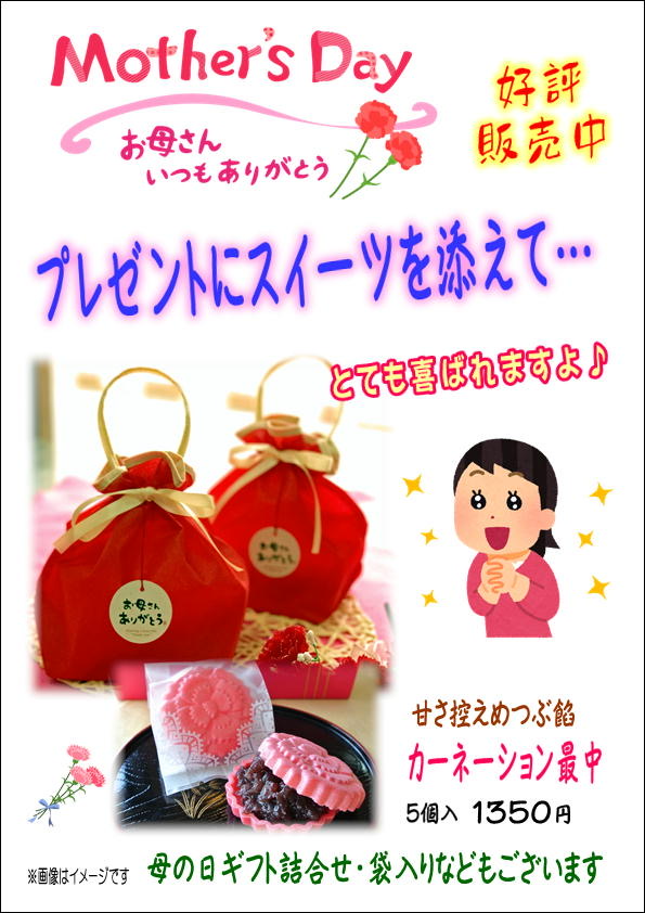5/12(日)は、「母の日」ですね。 お母さんに「いつもありがとう」と、 日頃の感謝を込めてお祝いしましょう♪ 🌹かわいい巾着に入った「カーネーション最中」 好評販売中です!他にも「ありがとうせんべいとカーネーション最中の袋入りも人気でよく出てます! 🎁プレゼントにスイーツを添えると、 一層喜ばれること間違いなし❗️ですよね♪ 皆様のご来店お待ち申し上げます。