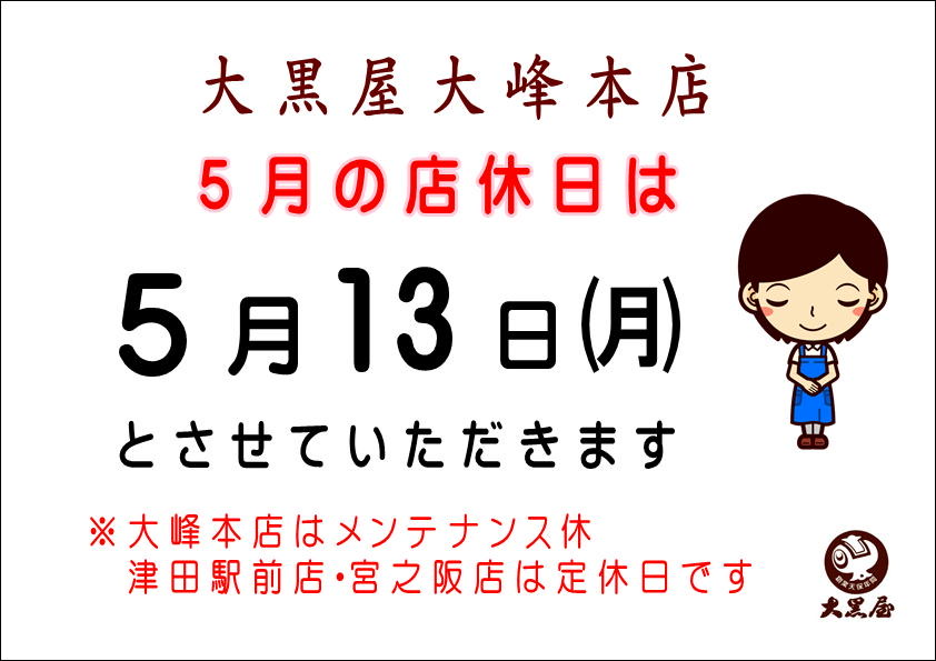いつもご愛顧賜り、ありがとうございます。 5月の全店店休日は5/13㈪です。 ※大峰本店は月一回のメンテナンス休。 津田駅前店・宮之阪店は定休日です。 ご迷惑をお掛けいたしますが、よろしくお願い申し上げます。