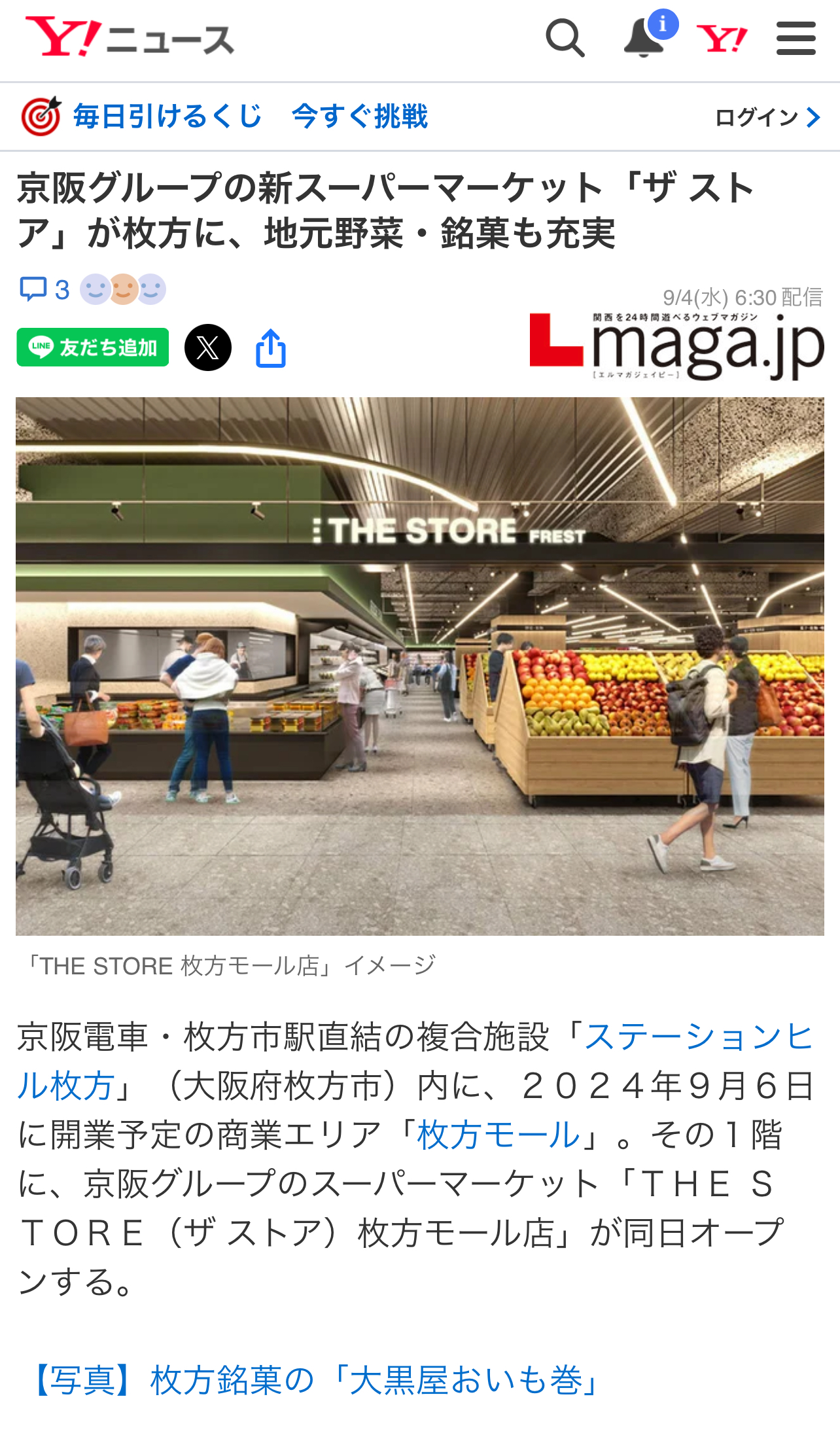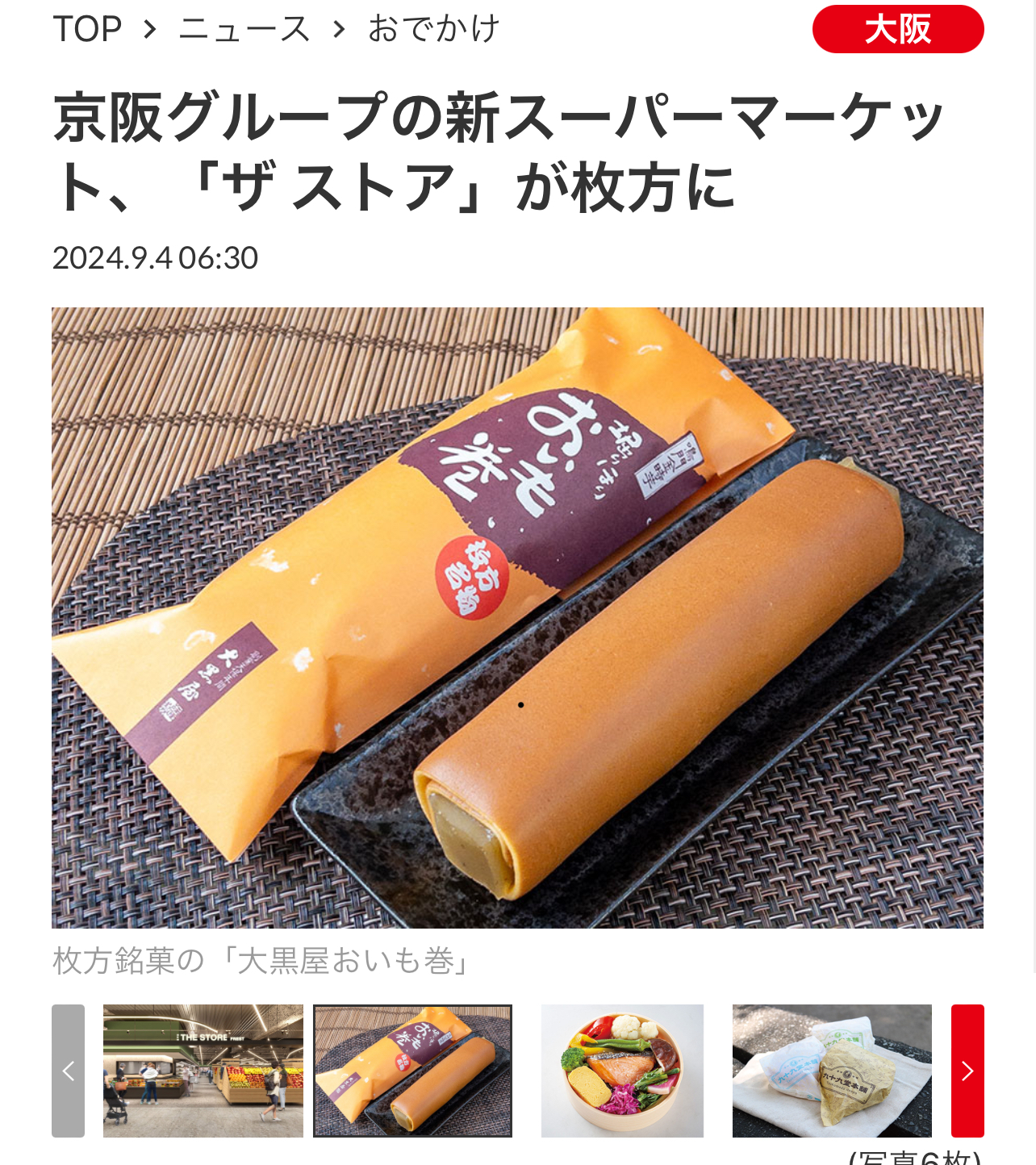 昨日グランドオープンした、枚方モール内にある 「ザ ストア」様にて大黒屋の商品も販売して いただいております! ヤフーニュースにて、枚方名物「おいも巻」も載せてくれました😄