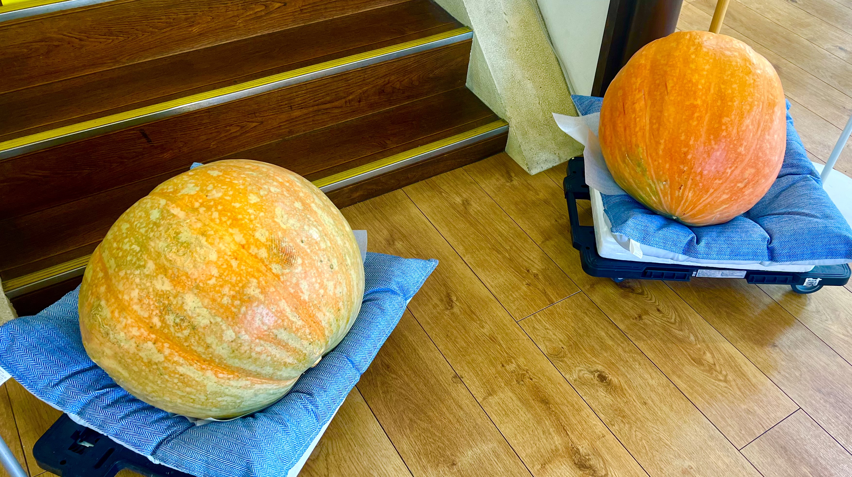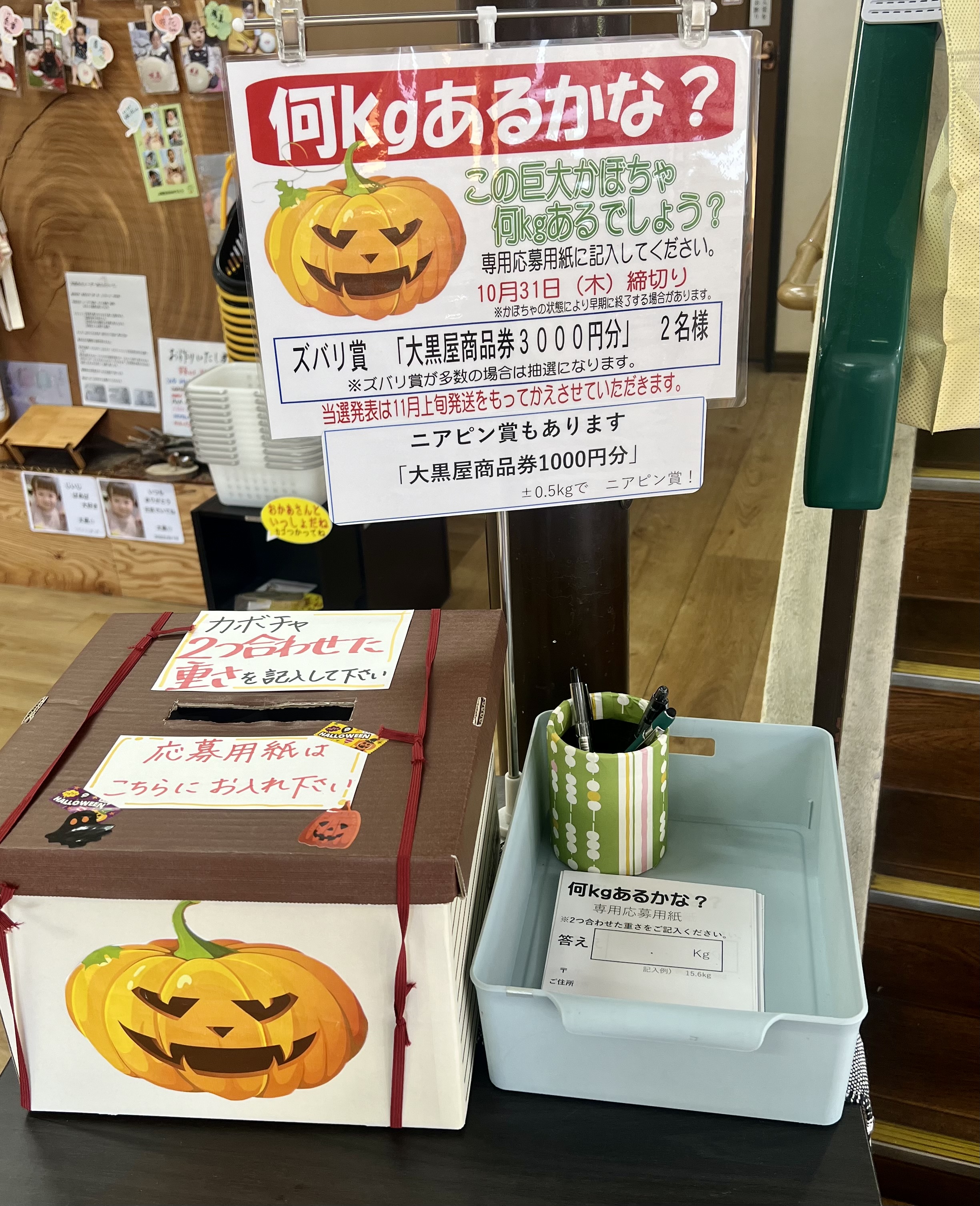 只今、毎年秋恒例の「巨大かぼちゃ、何キロあるかな?」 クイズを大峰本店で開催中です。 大きすぎるので、持ち上げるのは無理ですので、見た目の感で答えを応募してくださいね。 ◎賞品、ズバリ賞「大黒屋商品券3000円分」2名様❗️ ◎ニアピン賞もあります「大黒屋商品券1000円分」 ※土0.5kgでニアピン賞 ご来店の上、是非ご応募くださいね♪