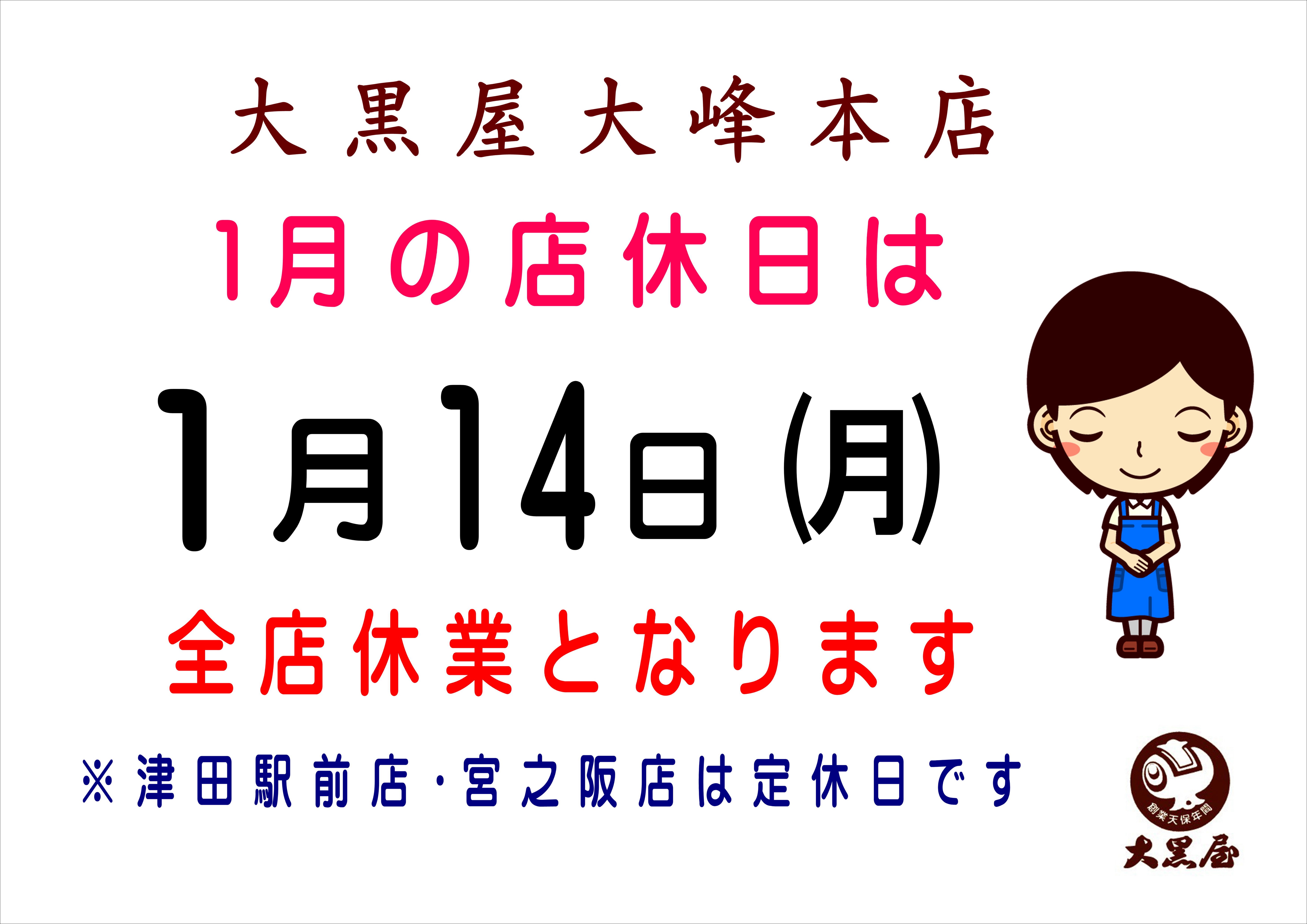 ㊗️新成人の皆さん、おめでとうございます❗️ これからの人生が、幸多き日々でありますよう、 お祈り申し上げます。 さて、明日1/14(火)は全店休業となります。 ご了承の程、よろしくお願い申し上げます。