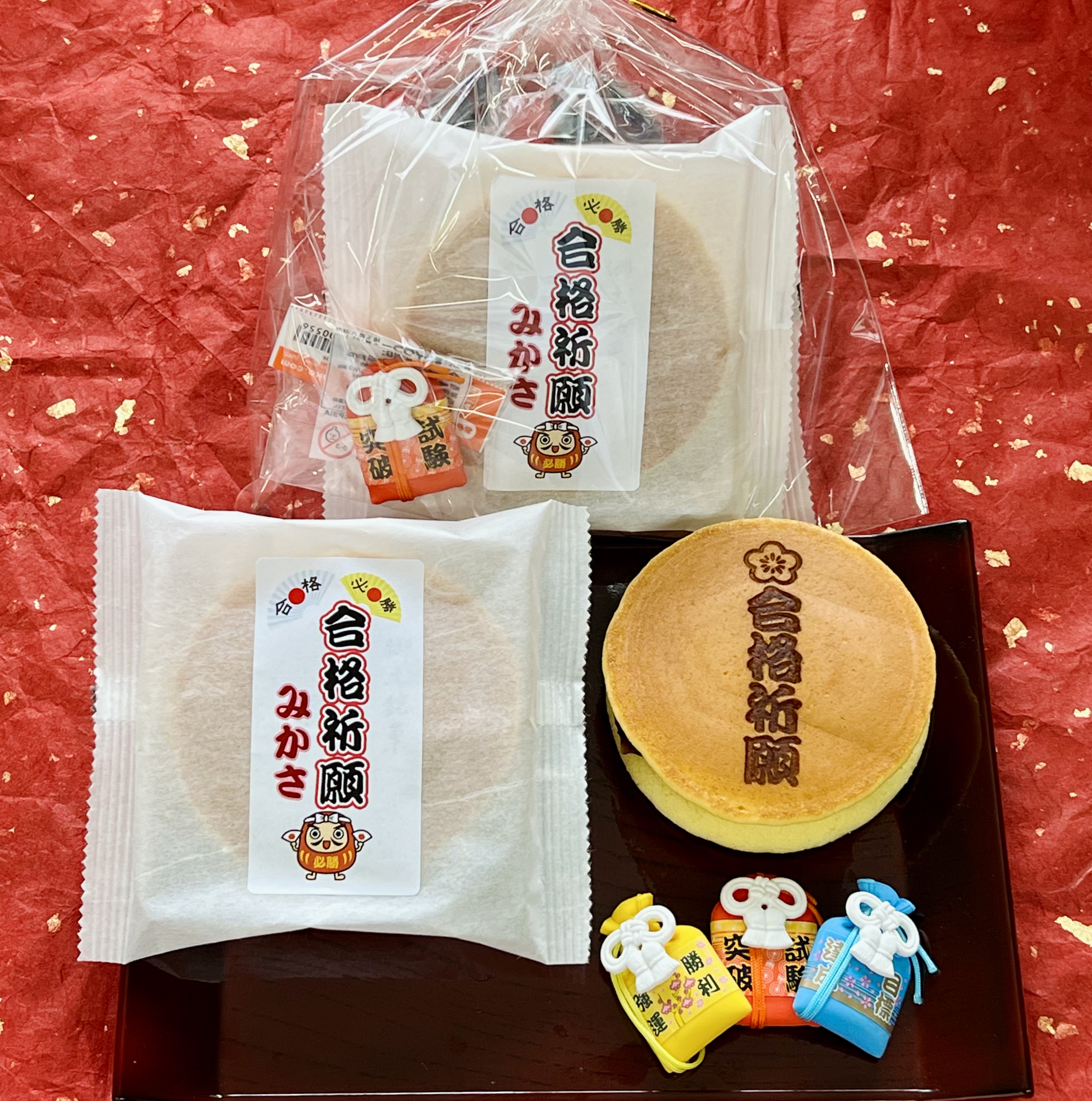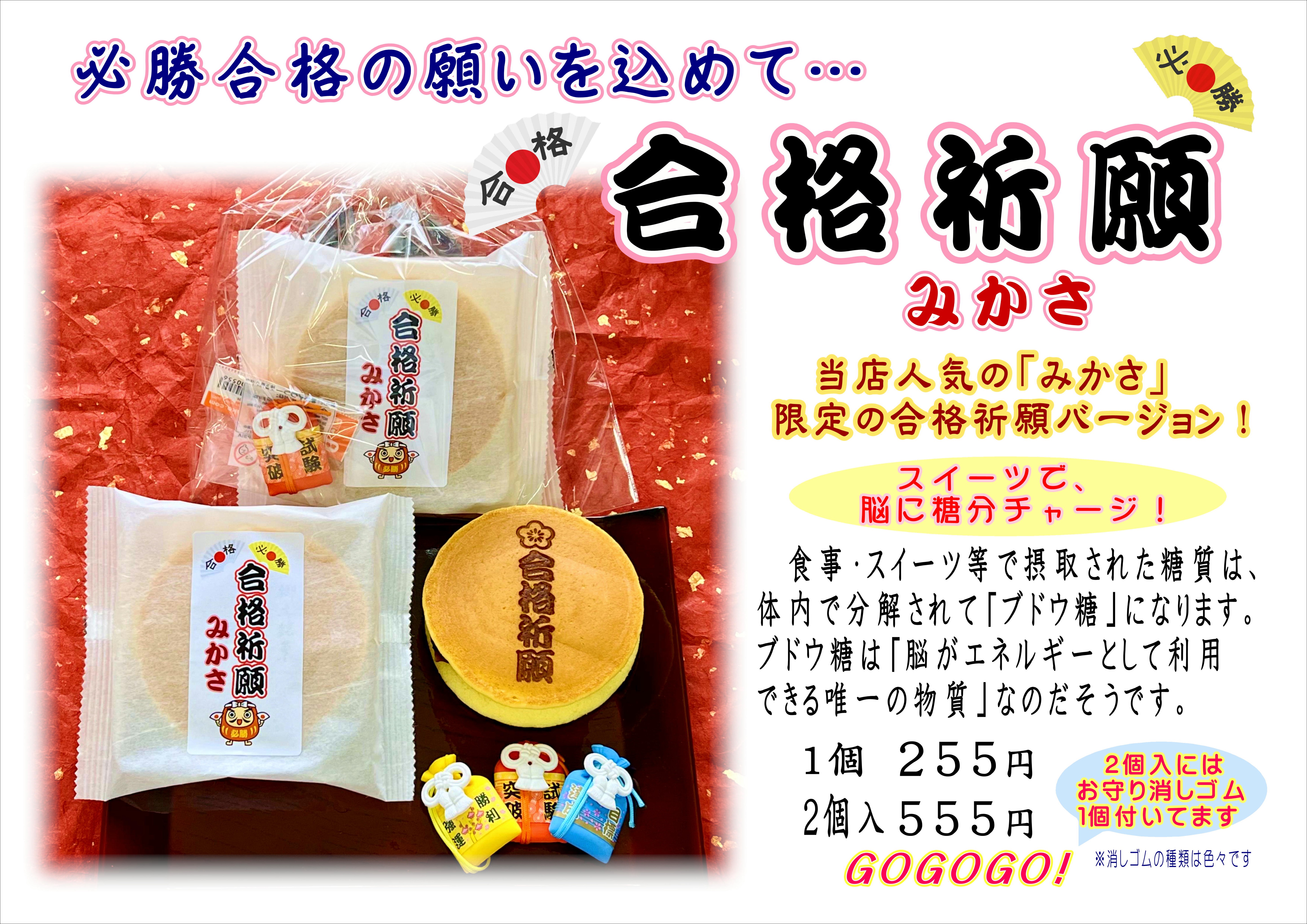 おはようございます。 雨は朝のうちに止みそうですね☺️ さて、今受験シーズン真っ只中、当店新企画商品の 「合格祈願みかさ」を本日より販売いたします。 人気の「郷土銘菓みかさ」に合格祈願の焼印を押し、 2個入りには「お守り消しゴム」をお付けしました。 このみかさを食べて、「脳内に糖分をチャージ!」 必勝合格の願いを込めましょう☺️ お電話でのご予約も承っております。 ※期間限定商品のため、予告なく終売する場合があります、予めご了承ください。 また、明日2/3は全店休業となります。