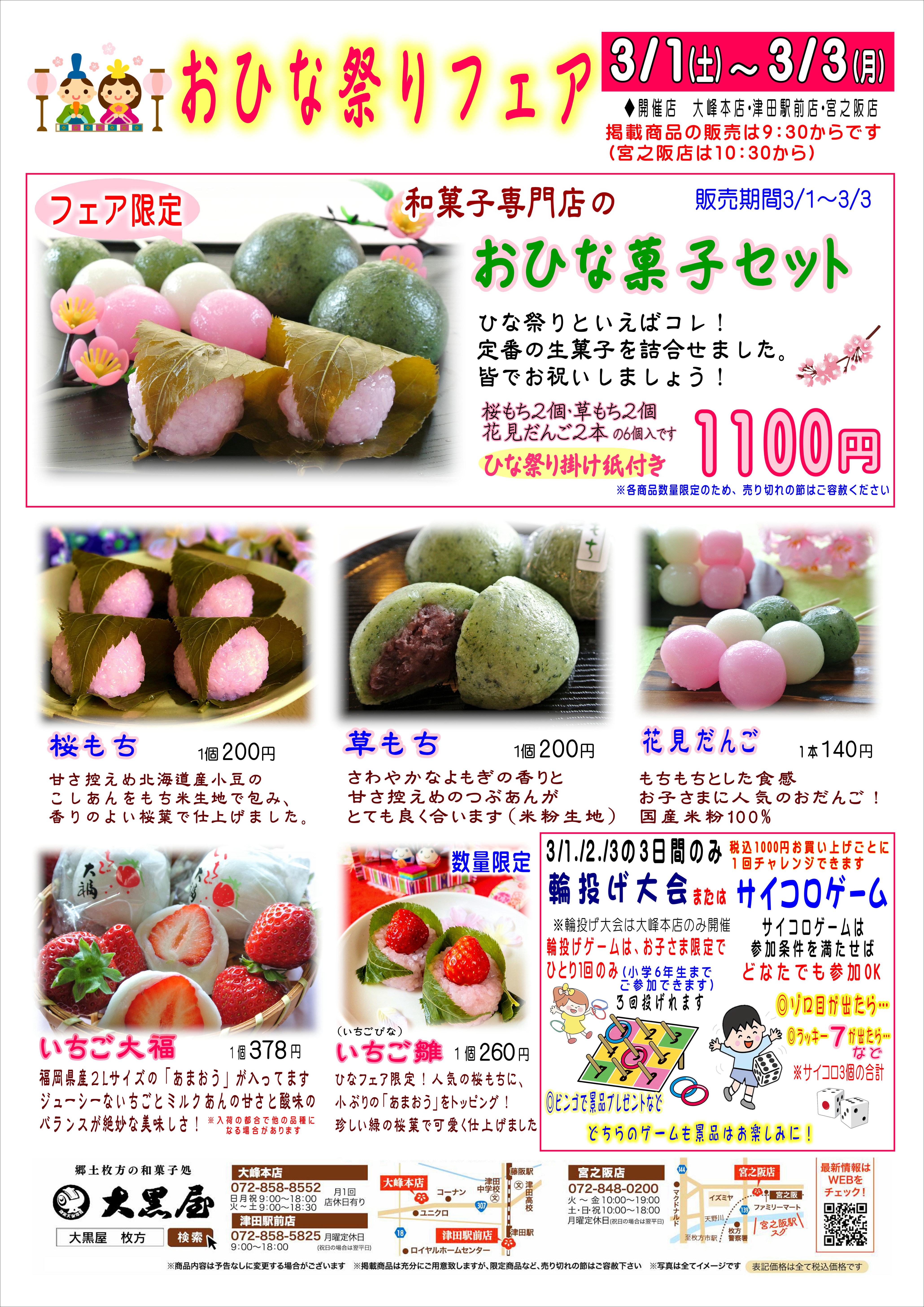 「あまおうの🍓いちご大福」などなどを取り揃えております。またおひな祭りフェア限定の「梅ひじきおこわ」も登場いたします!