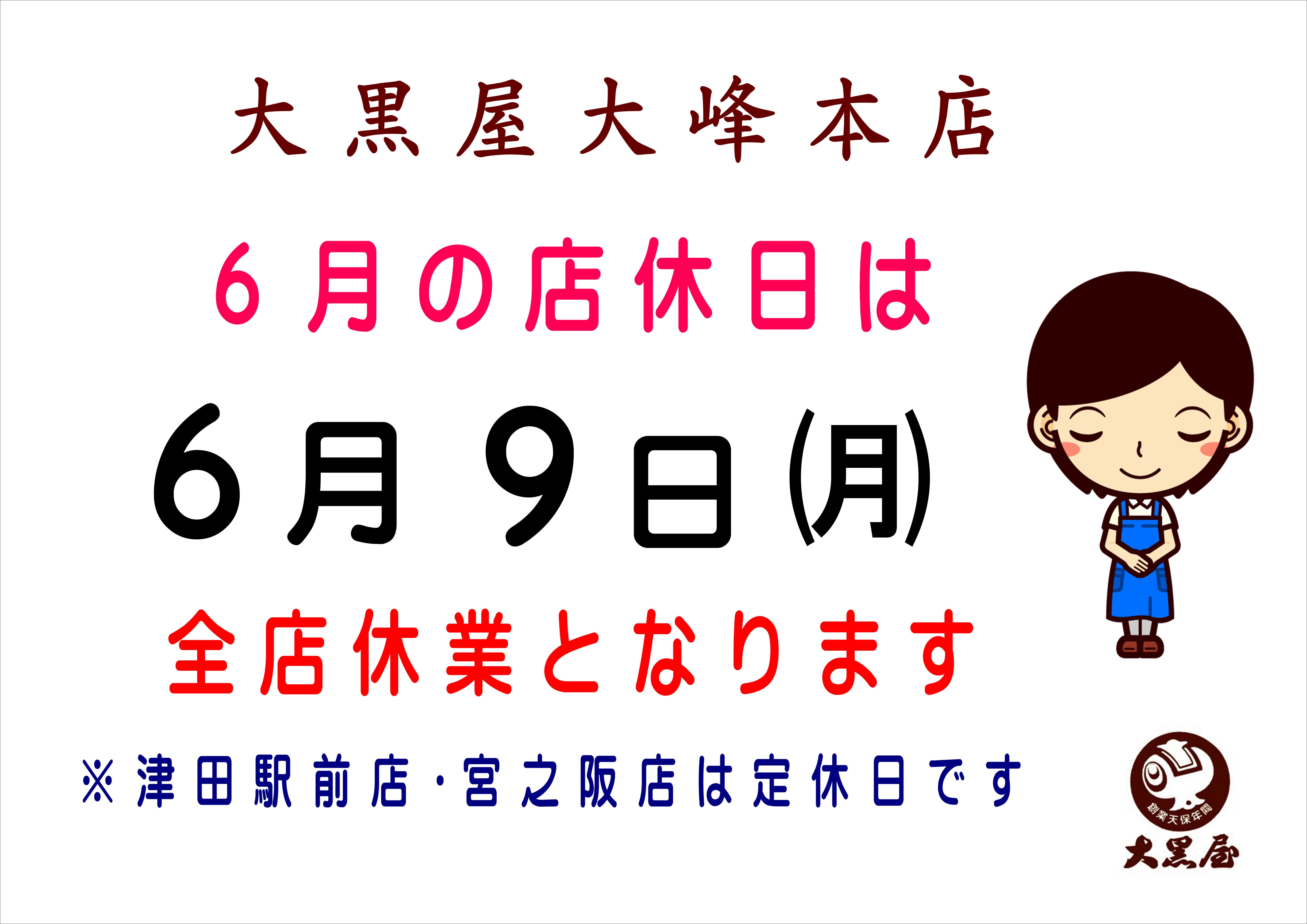 明日6/9(月)は全店休業日となります。 ご迷惑をおかけしますが、何卒よろしくお願いいたします。