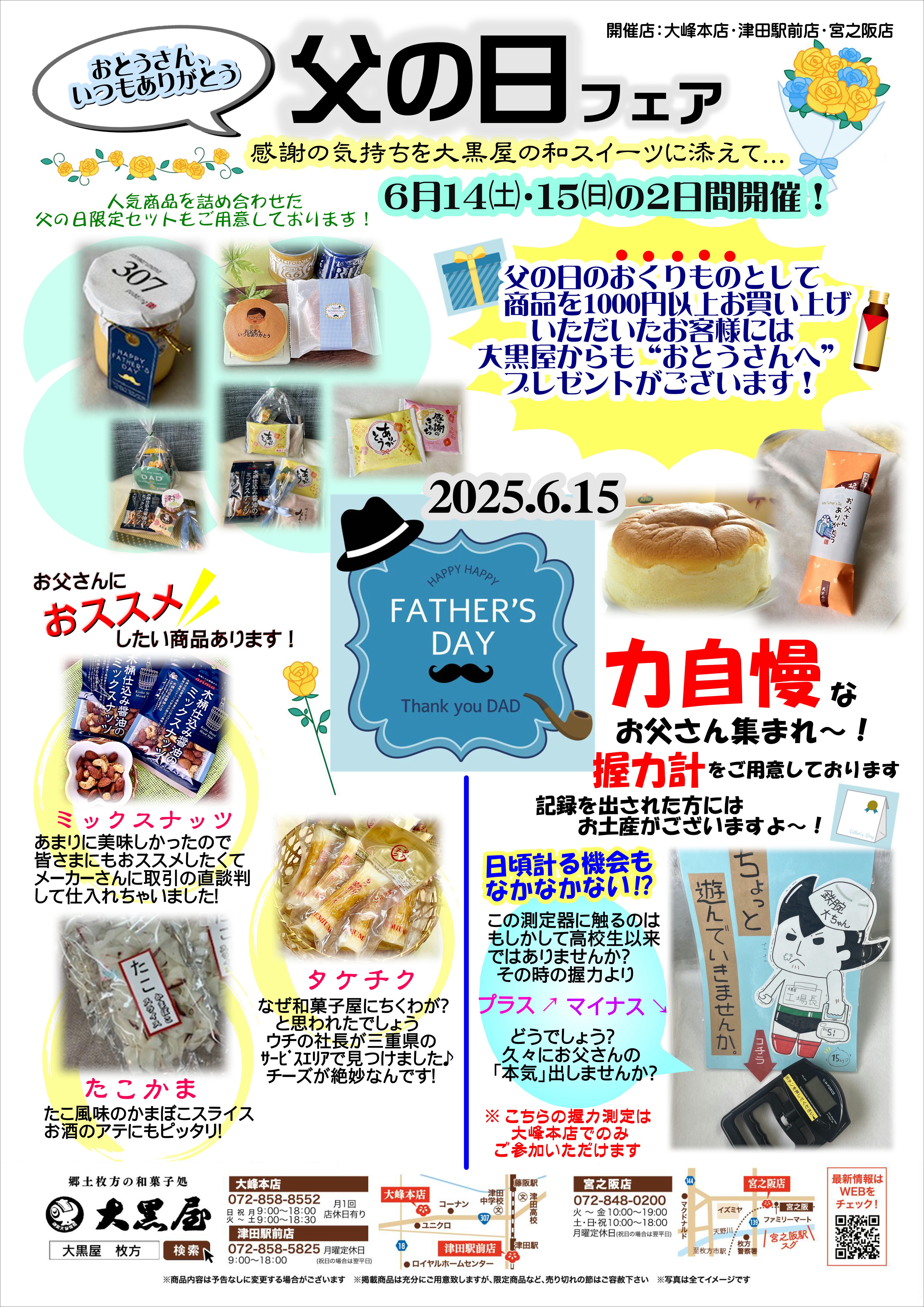 おはようございます。 明日6/15(日)は「父の日」ですね。 「お父さん、日頃のお仕事おつかれさま☺️」の気持ちを込めて、🎁プレゼントに「スイーツ」を添えてみませんか? 甘いものは疲れをとる効果もありますよね♪ また、大峰本店では、握力計で力自慢!コーナーを作りました!また、父の日にと、1,000円以上お買い上げの方には、当店からお父さんに「栄養ドリンク」をプレゼントいたします。 三重のおぼろタオルで仕上げたくらわんかファブリック「サウナタオル」も販売してます!(大峰本店のみ) 是非ご来店くださいね♪