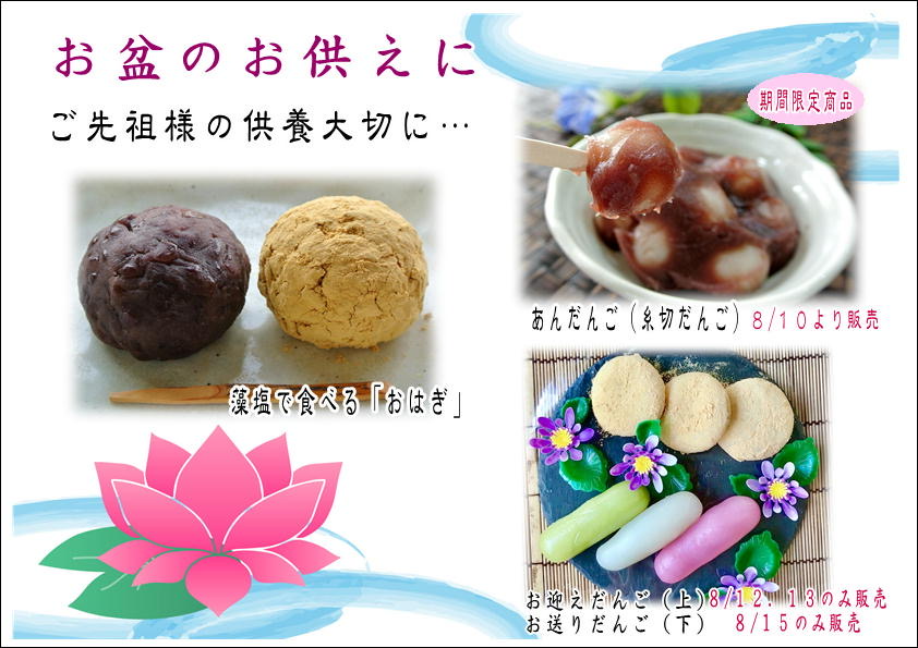 🪷お盆のお供えに… おはぎ・あんだんご・お迎えだんご・お送りだんごなどの生菓子のほか、かごギフトなどをお供えされる方も多くいらっしゃいます。 🪷ご先祖様の供養、大切に。