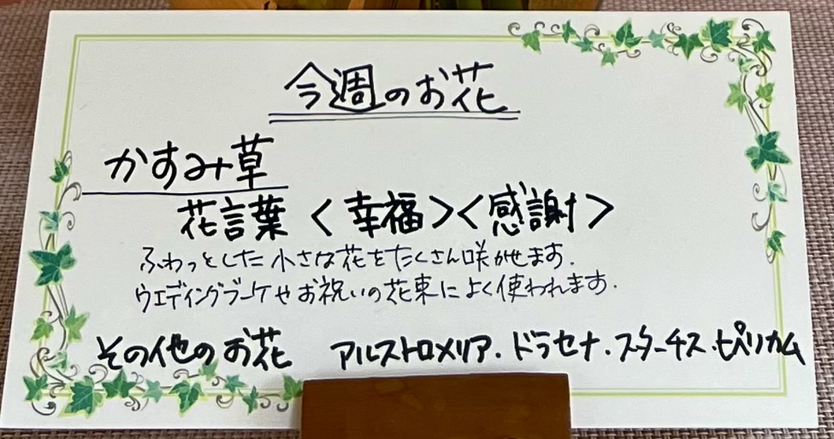 今週の💐お花は「かすみ草」です☺️ 大峰本店入り口あたりに、週替わりの「💐お花」を飾らせていただいており、ご来店のお客様から好評をいただいております。 ※交野市南星台にあるフラワーショップ「ラフィネ」さんに ご協力いただいております。