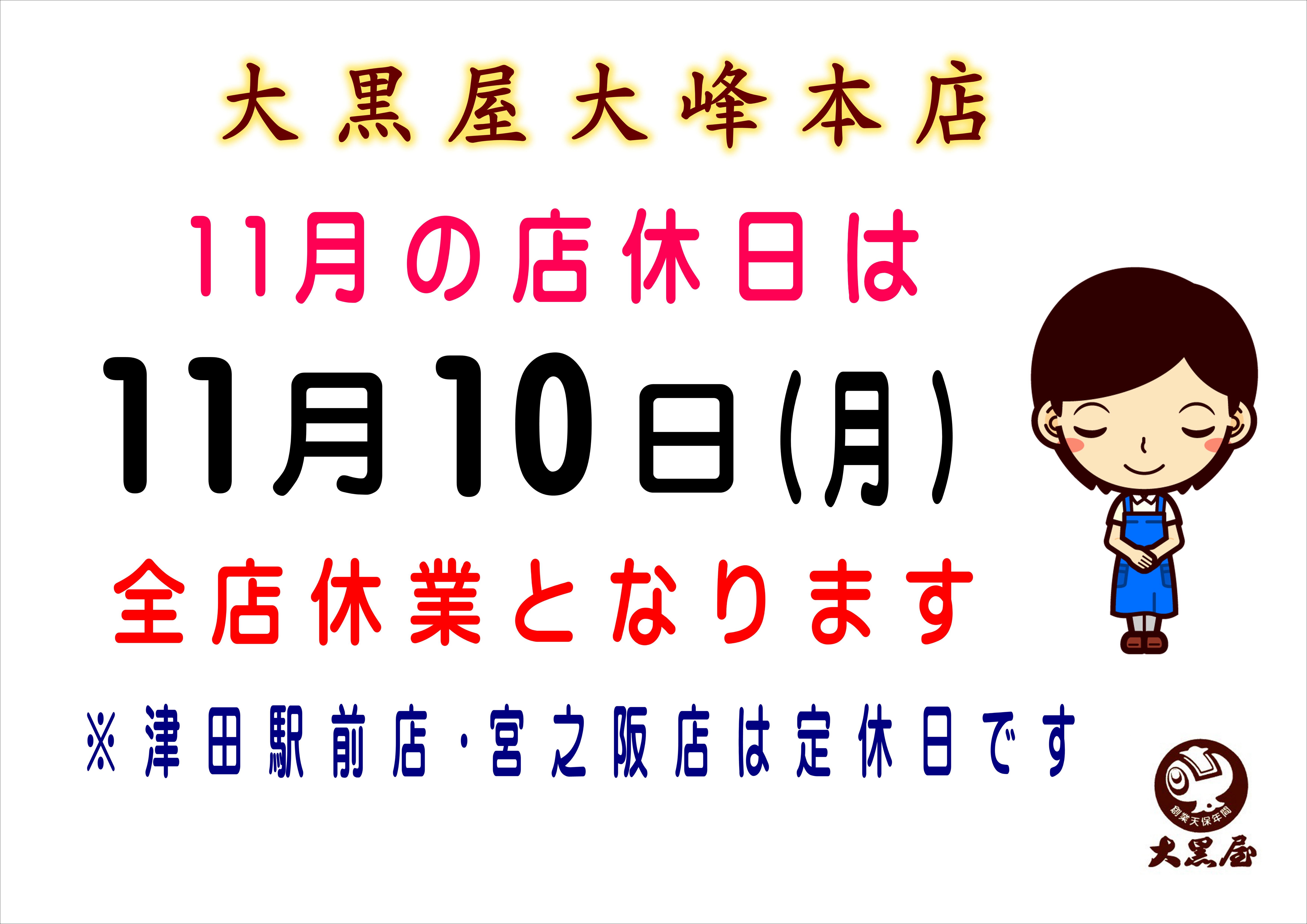 おはようございます。 明日11/10(月)は全店休業いたします。 ご迷惑をおかけしますが、何卒よろしくお願いいたします。
