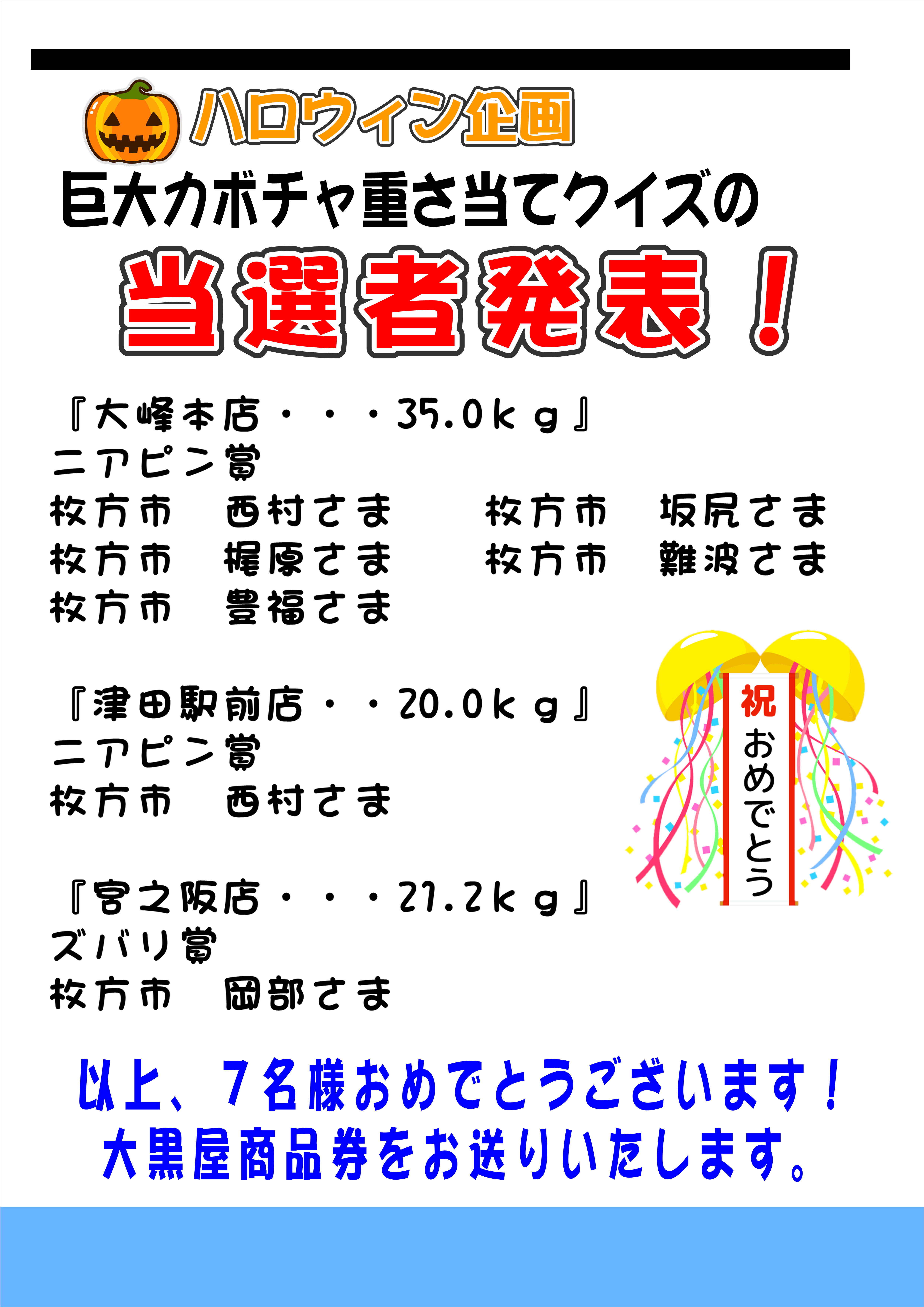 🎃ハロウィン企画の「巨大カボチャ重さ当てクイズ」の当選者が決まりました! 当選された方、おめでとうございます。 たくさんのご応募、本当にありがとうございました。