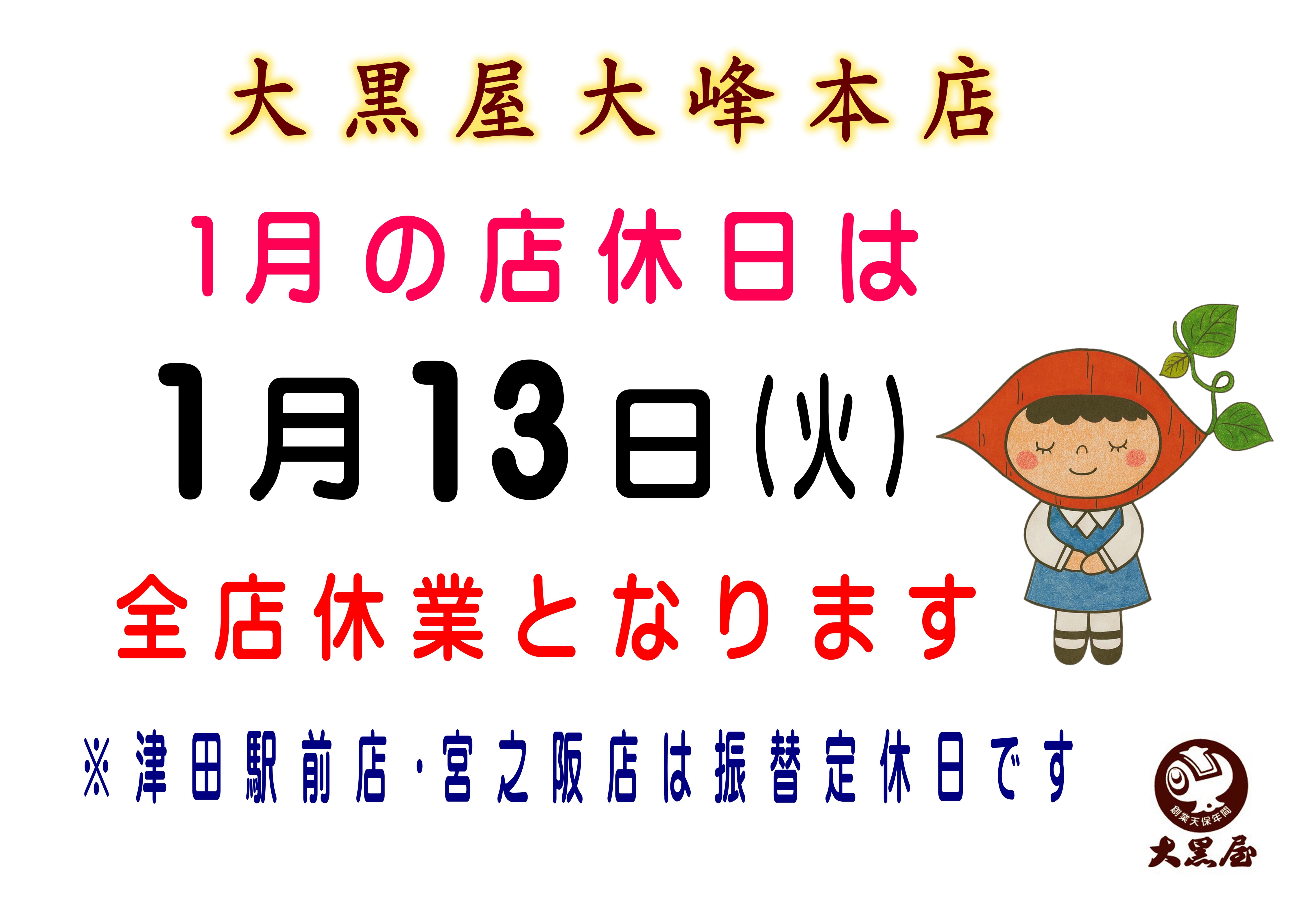今月の全店店休日は、1/13(火)となっております。 何卒よろしくお願い申し上げます。