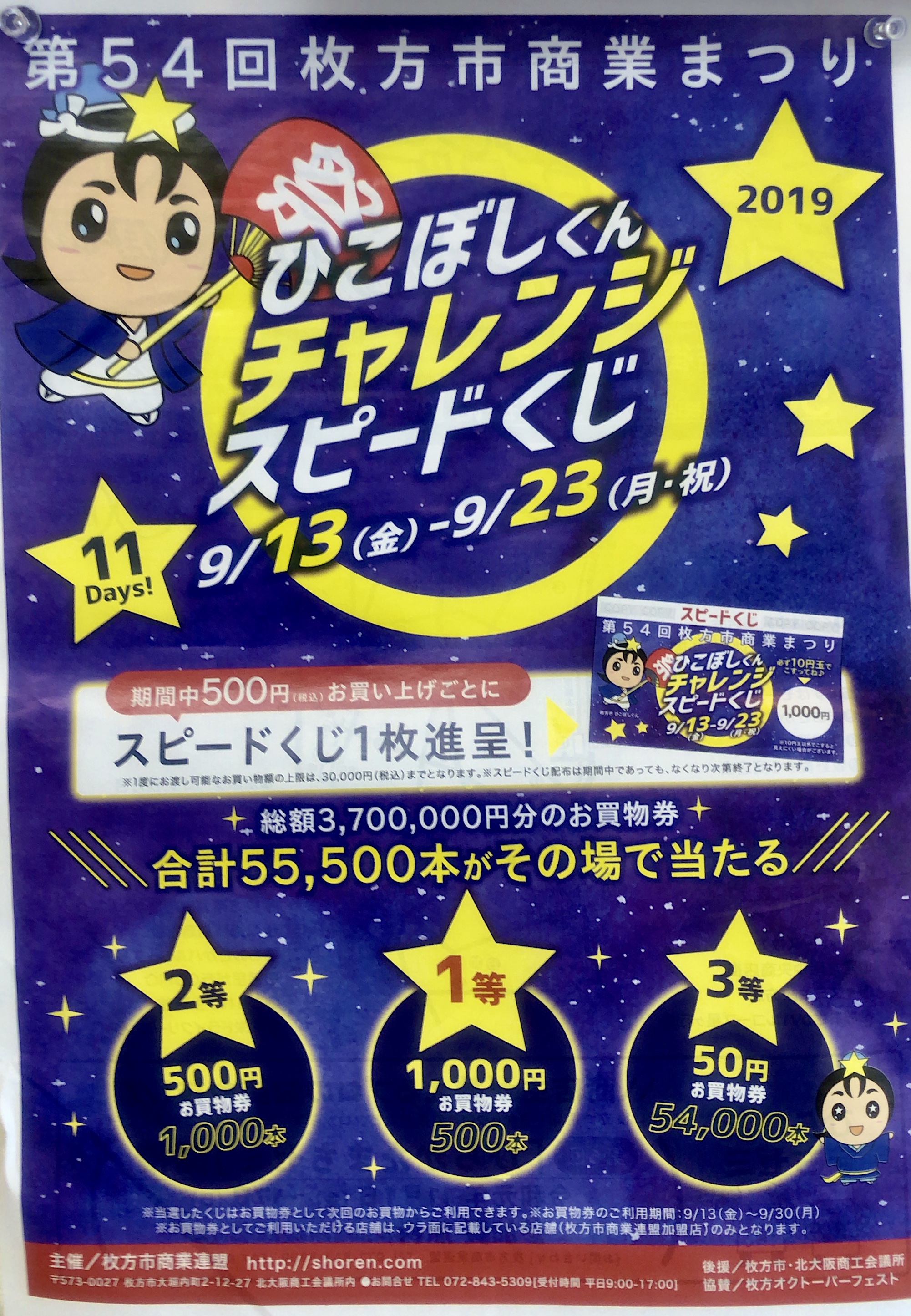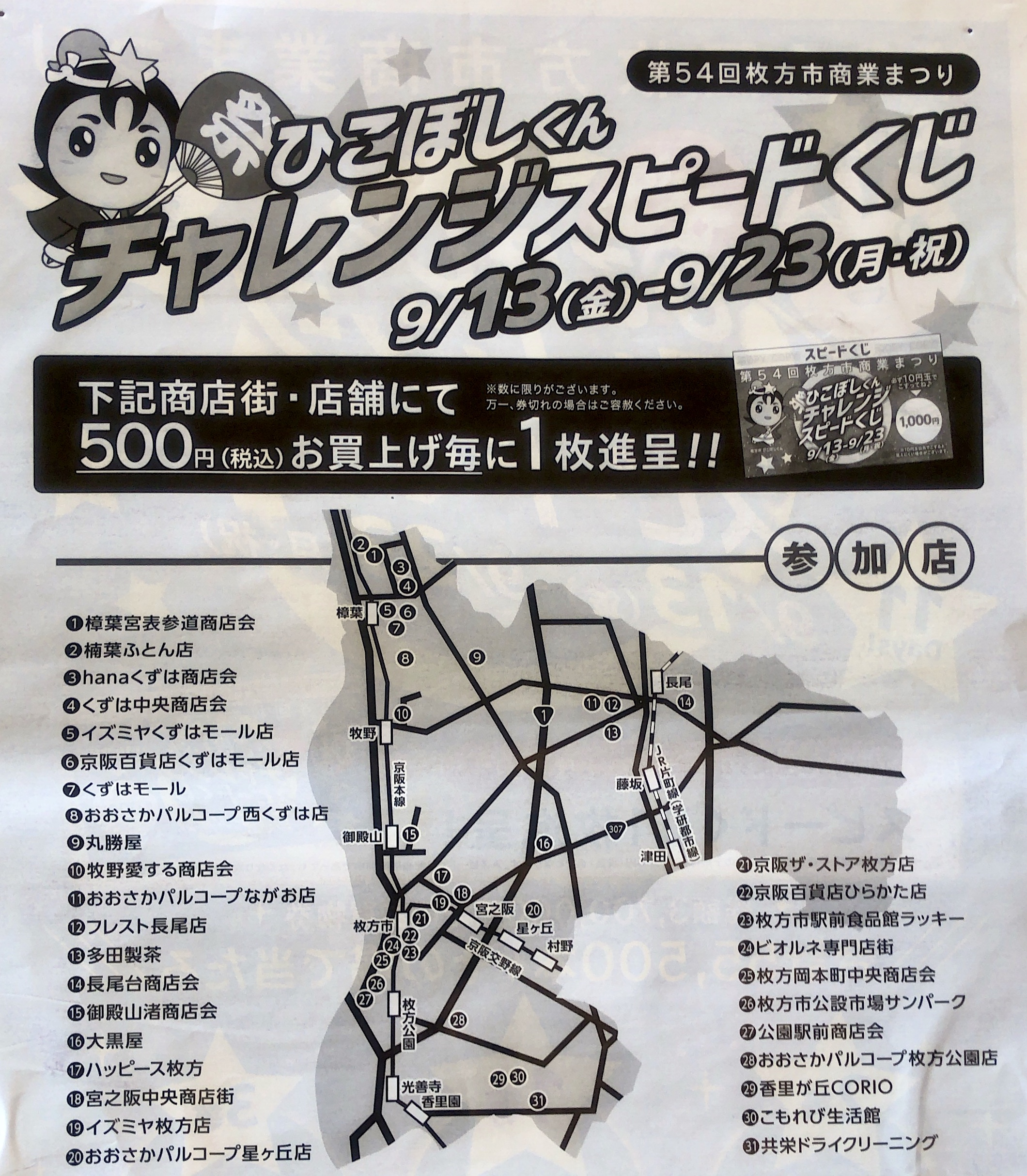 枚方市商業連盟主催で、本日より「ひこぼし君チャレンジスピードくじ」が始まりました! 500円お買い上げで1枚進呈。 1等 1,000円のお買い物券など。 加盟店は2枚目の画像ご覧ください。 枚数に限りがあり、早期に終了する場合があります。