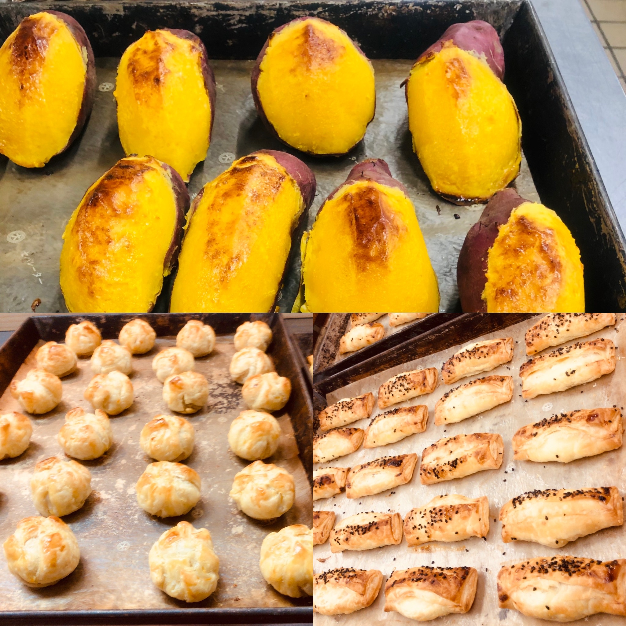 本日開催の「収穫祭」のメイン商品 このイベントしか売らない「丸ごとスイートポテト」、本日新発売の「栗パイ」好評発売中の「芋チーパイ」朝イチから焼いてます! 皆様のご来店お待ちしております。