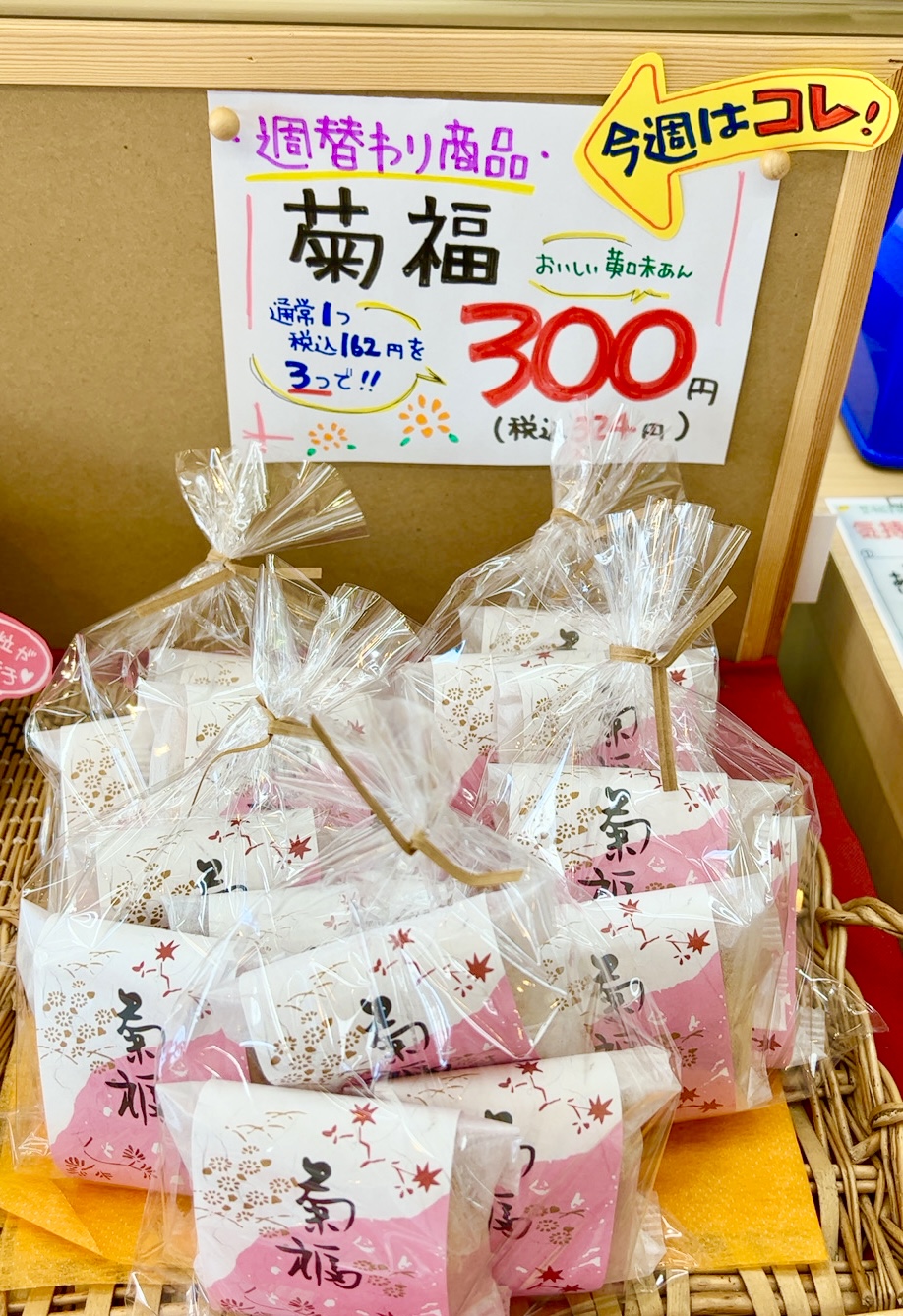 毎週火曜日~日曜日、津田駅前店・宮之阪店協賛で「週替わり奉仕品」を販売しています。 今週2/1㈫~/6㈰は、「枚方銘菓 菊福」です。 発売以来約40年、人気の焼饅頭です。秘伝の薄皮生地の中に、甘さ控えめの「黄身餡」を包みました。 しっとりとした美味しさを是非ご賞味ください。 3個入り486円を324円(税込)